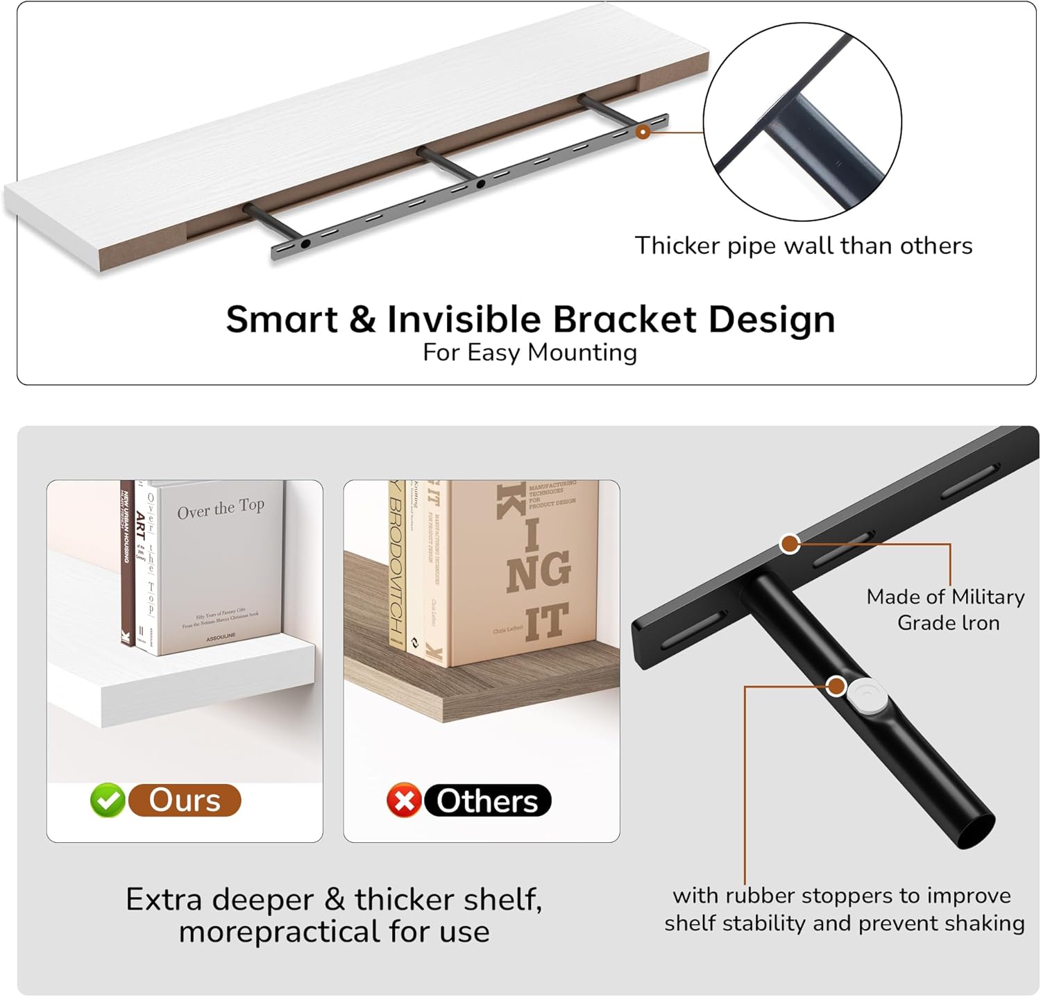 - Extra Deeper & Thicker - Each board measures 55"W x 9.3"D x 1.8"H. Extra deeper and thicker design in order to bring maximizes storage space and weight capacity, even hold up to 80 lb each. This floating shelf taking up zero square feet, reduces clutter and highlights décor in compact spaces.