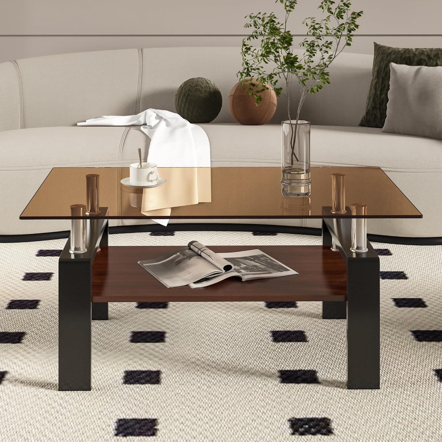 39" Brown Glass Coffee Table Walnut Modern Living Room Center Table Rectangle, with Wooden MDF Storage Layer, Black Metal Leg, for Small Apartment and Office, Brown