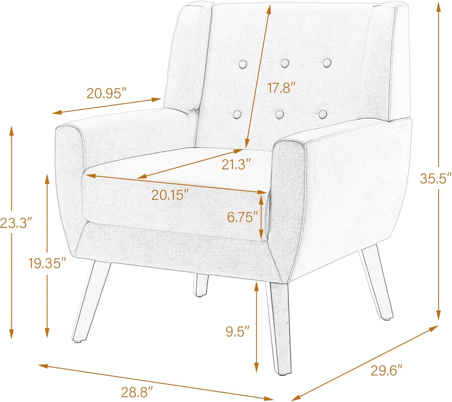 - Ergonomic & Comfortable Sofa Seating - The dimensions of this arm chair: 29.5 D *29 W* 35.5 H inches. The angle of the back, the position of the arms, and the width are designed according to the curve of the back of the human body, which is ergonomically designed to provide you with maximum comfort. Wide back and seat, which made of highly elastic sponges and springs, allowing you to rest and read throughout the day without discomfort