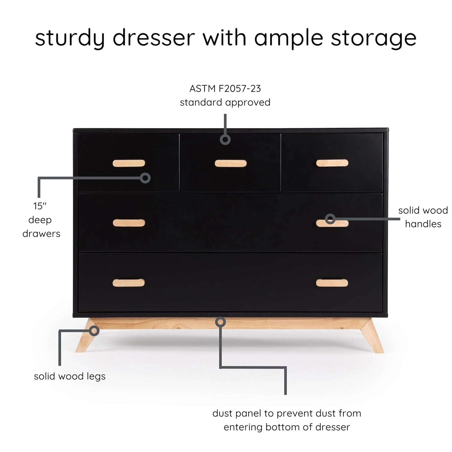 dadada Soho 5-Drawer Dresser for Nursery and Bedroom - Modern Design, Large Storage, Baby-Safe Finish, Soft Close Drawers, Anti-Tip Safety, Sturdy Legs & Solid Wood Handles, 47” Wide (Black+Natural)