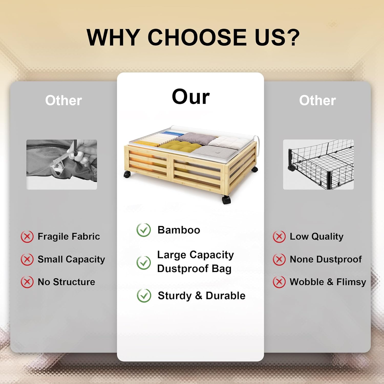 Under Bed Storage Containers With Wheels - 2 Pcs Bamboo Wood Rolling Underbed Shoe Storage Bins With Dust Bags for Clothes Blankets, Duvet Covers Snacks Toys (Natural)