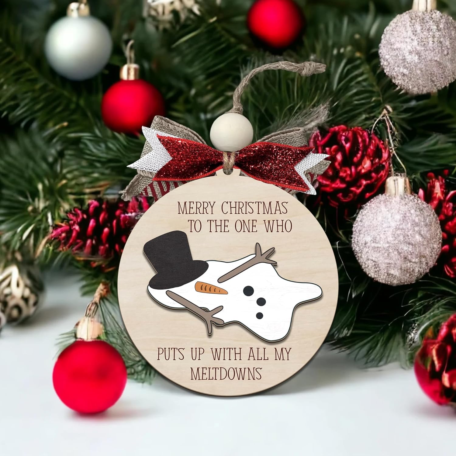 - โ๏ธ Cute melted snowman design โ Features a playful snowman puddle and the message โMerry Christmas to the one who puts up with all my meltdownsโ; a sweet, light-hearted snowman funny ornament that brings smiles to the tree.