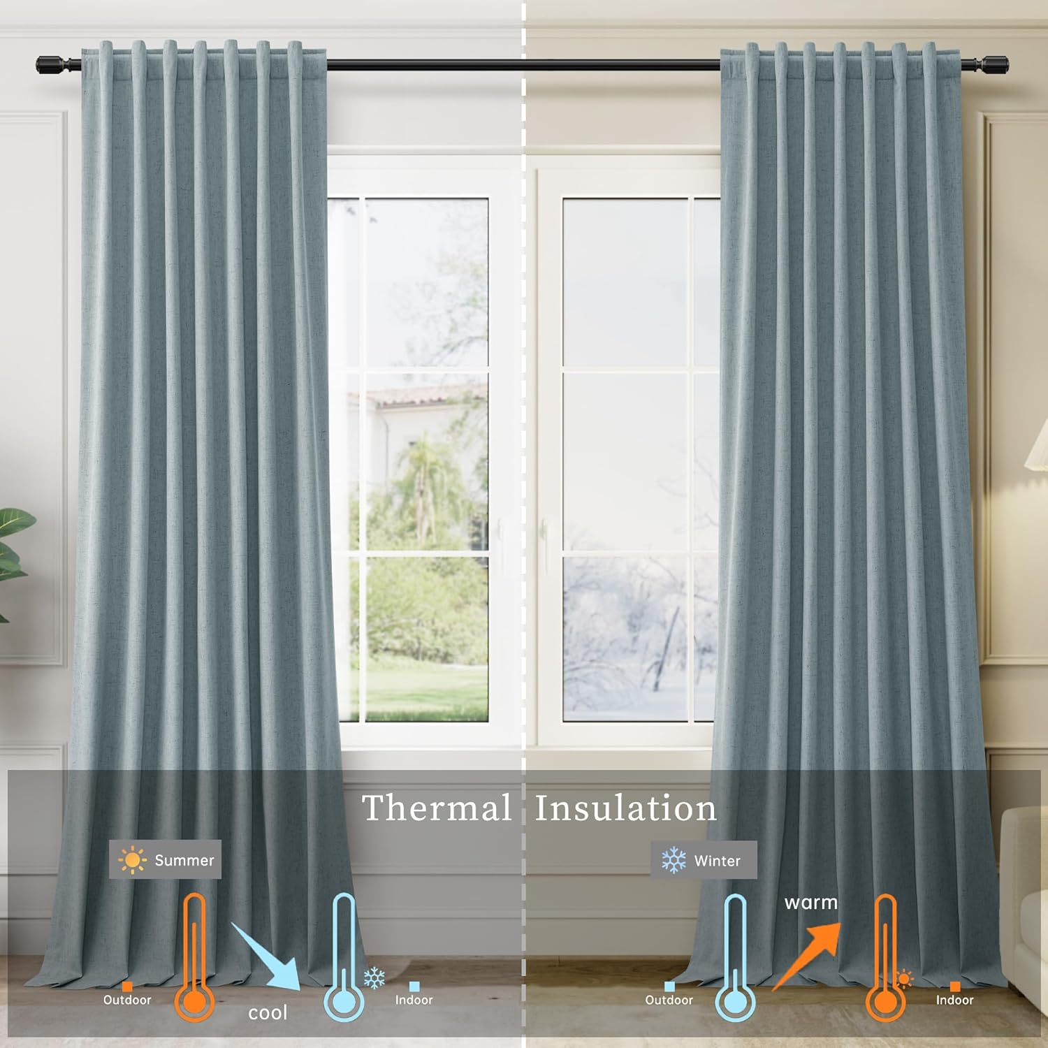 - Thermal Insulated Room Darkening Curtains: The blackout curtains with 300GSM high-density linen blend fabric block out the heat in summer and cool air in winter while sunlight blocking and soundproof. Provide a easy and comfortable home.