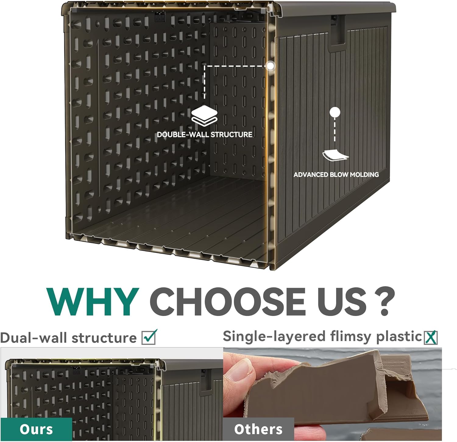 - Double-Layer Structure- Our all-weather resin deck box stands out with a double-layer structure and enhanced with internal reinforced steel beams, providing durability and resilience for outdoor use