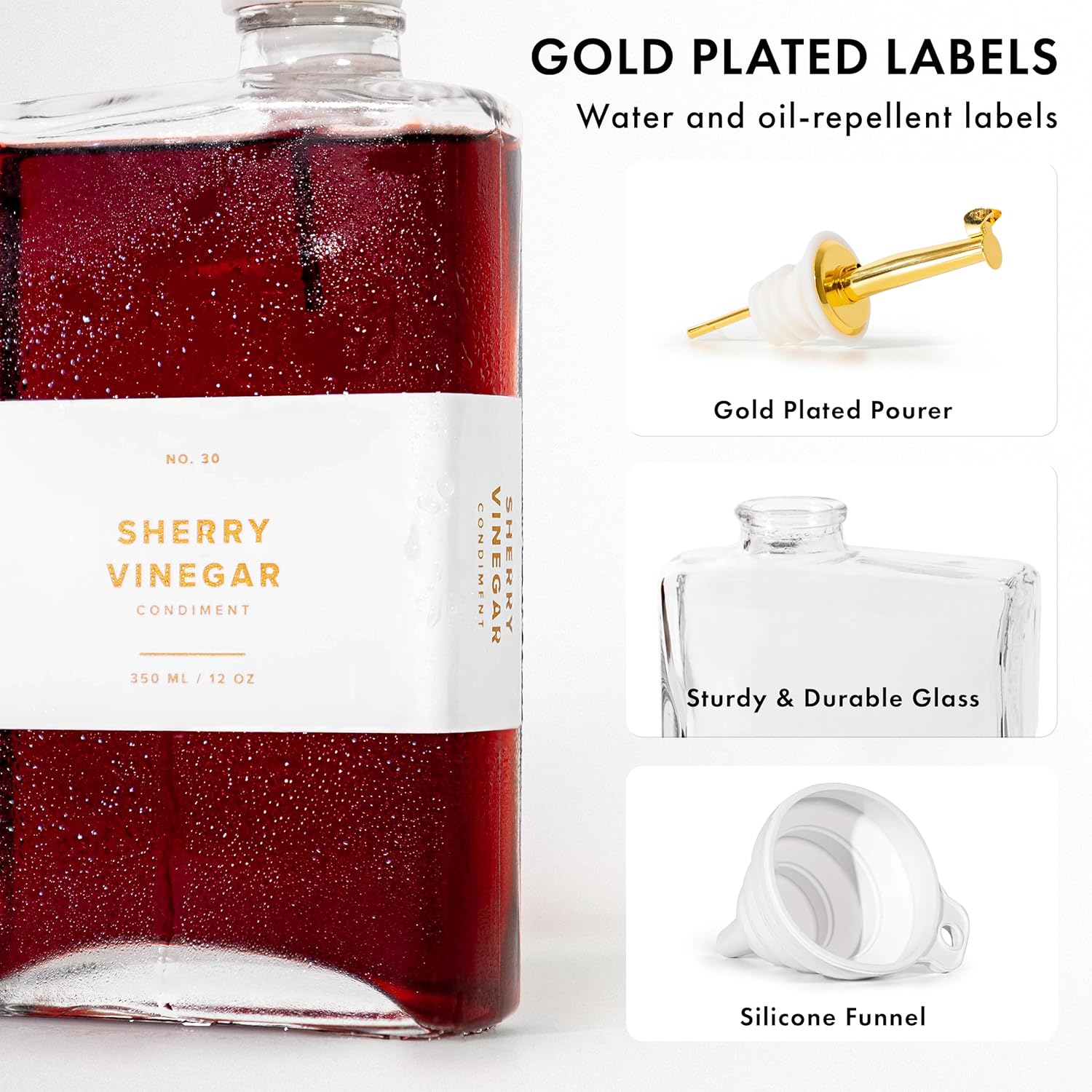 Glass Olive Oil Dispenser Bottle Set [2x12oz]: 36 Premium Gold Labels, Oil Dispenser for kitchen, Vinegar Bottle Set, Glass Dispensers for Soy Sauce, Syrup Bottles | Set of 2