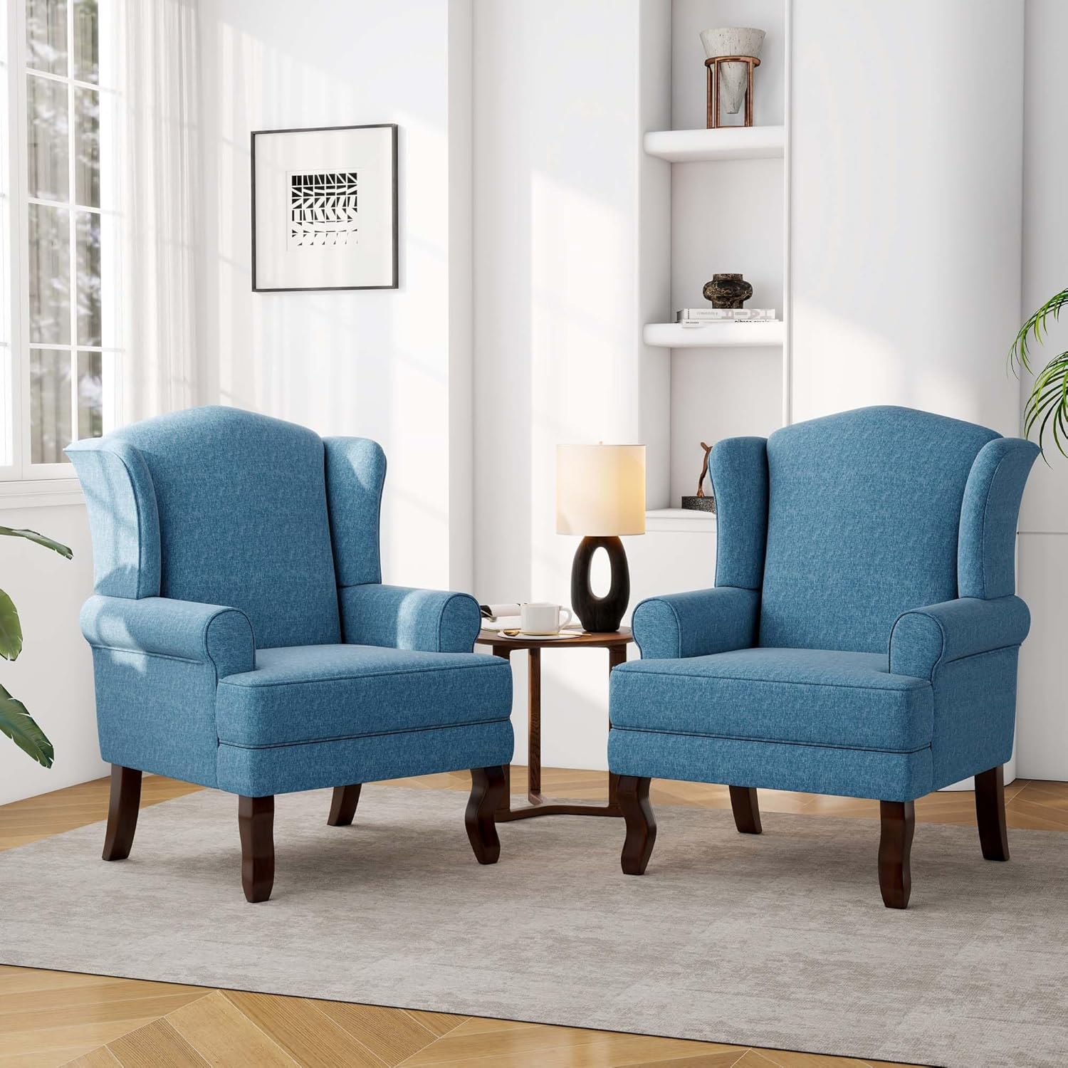 Accent Chair, High Back Upholstered Armchair with High Resilience Sponge & Wood Legs, Mid-Century Modern Comfy Single Sofa Reading Chairs for Living Room, Bedroom (Blue, Set of 2)