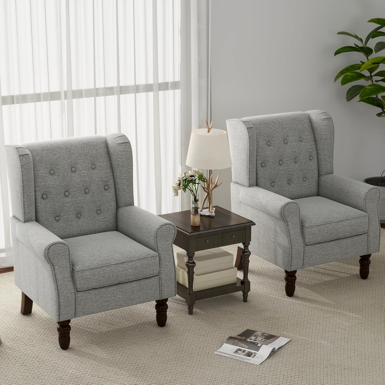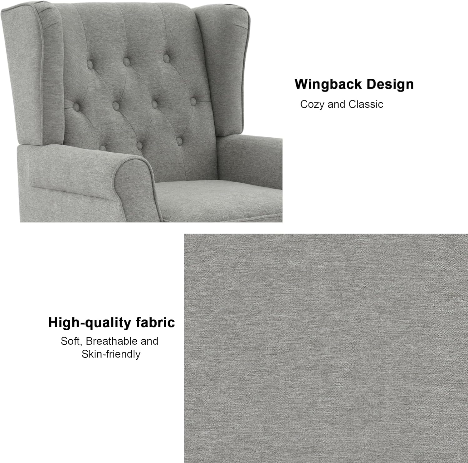 Accent Chair, Upholstered Armchair with Button Tufted High Back & Solid Wood Legs, Comfy Wingback Reading Single Sofa Chair for Small Spaces, Living Room, Bedroom (Light Grey, Set of 1)