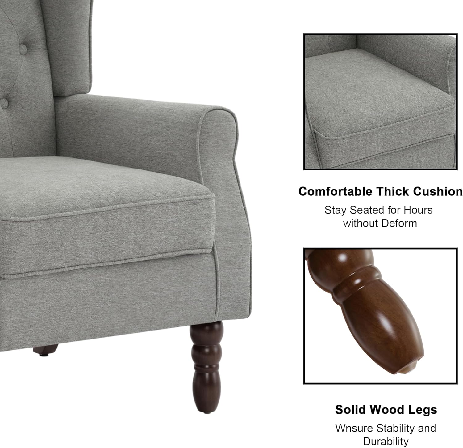 - Comfy and Robust Build Reading Chair: Our comfy bedroom chair with solid wood frame construction can easily support the weight of 400 Lbs. And the cushion and back of this sofa chair is made of high-density and high-elasticity foam, which can provide you with maximum comfort