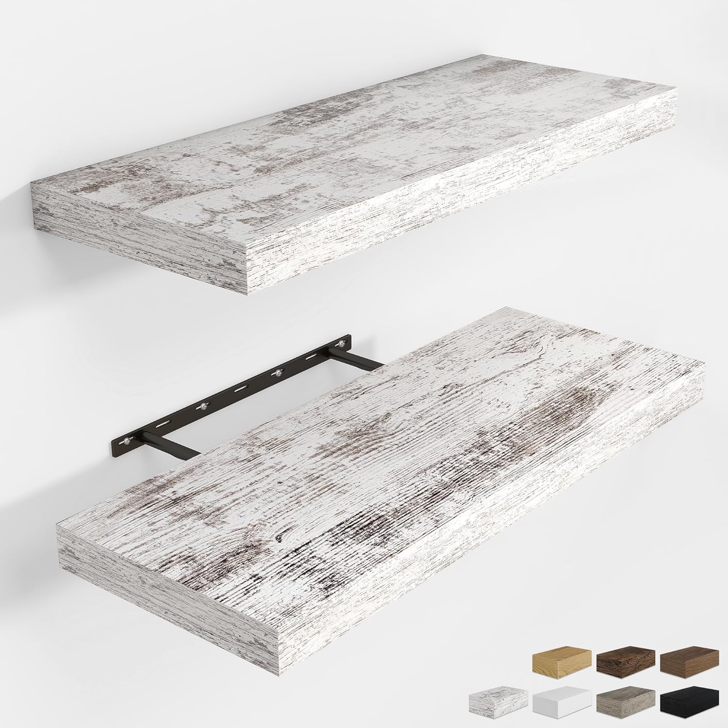 - 24 Inch Floating Shelves for Wall (Set of 2): Each wall shelves are 8 inches in depth and 1.5 inches in thickness. 2-piece set is more cost-effective and practical. Our wall shelf can be used in combination, staggered high or low on the wall, or mounted side-by-side to provide extra storage space for organizing small items and clutter in multiple areas such as kitchens, bathrooms, and bedrooms, creating a clean and smooth look. Multiple colors available