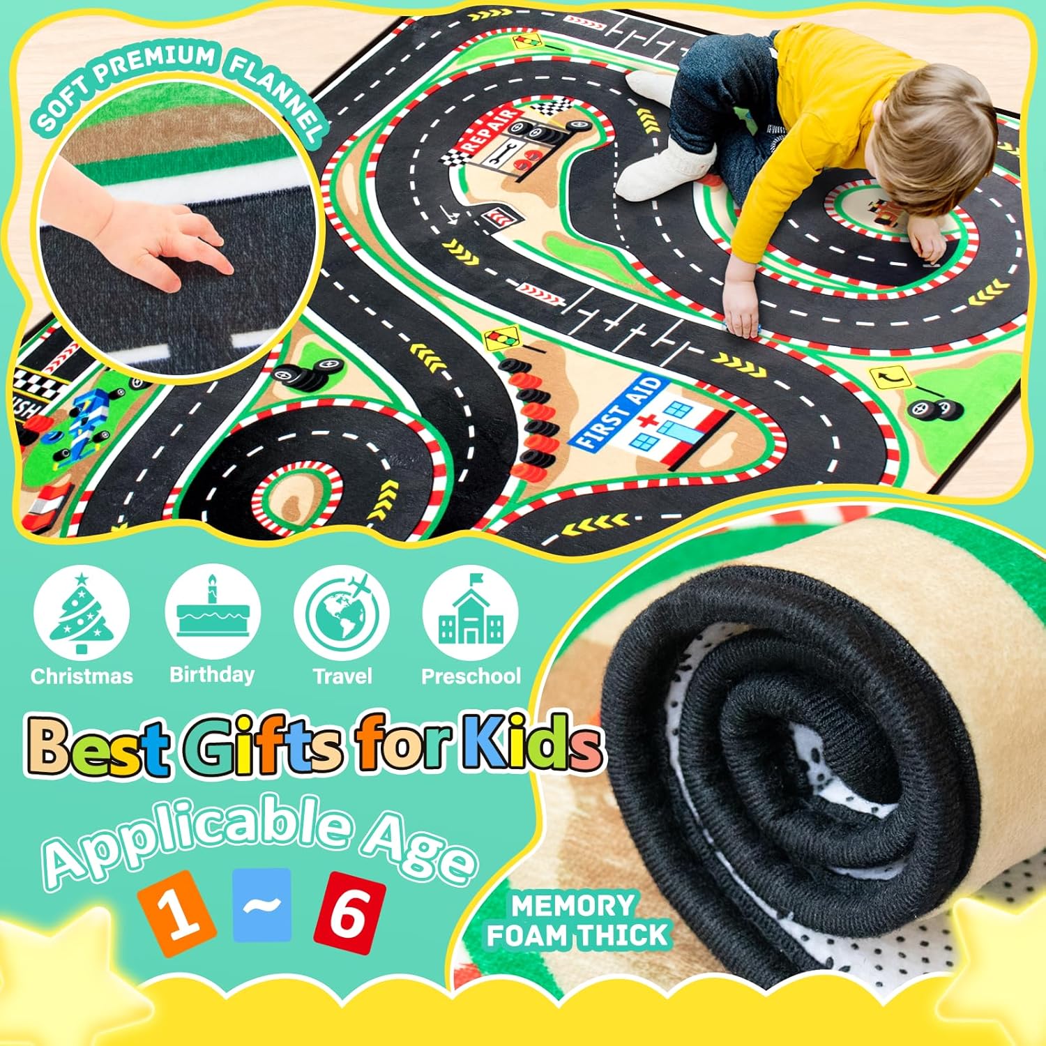 - [Unique Design]: This race track rug features a realistic 3D cascading surround route, complete with a start, and Finish line markings. The car rug is perfect for kids who enjoy playing with race cars. The vibrant colors enhance indoor play, creating an exciting outdoor experience at home