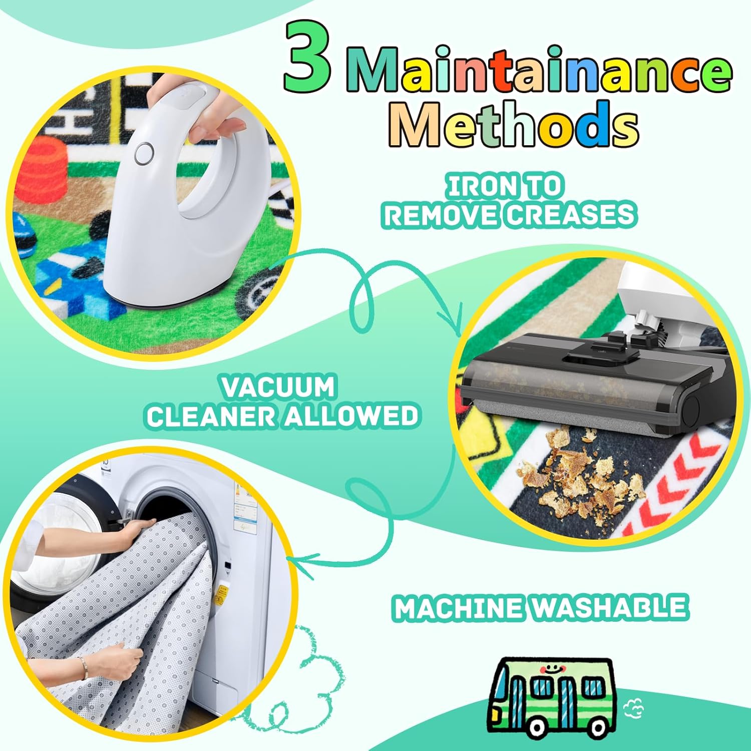 - [Machine Washable Kids Play Rug]: This car rug for kids toy cars measures 3 x 5 feet/36*60 inches. 0.4'' thick. Our mat is easy to clean by vacuum or machine. Perfect bedroom rug, living room rug, and playroom rug