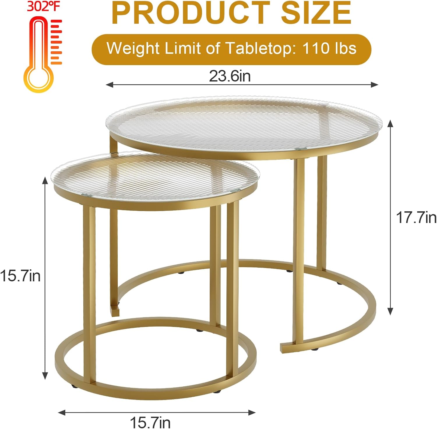 aboxoo Nesting Coffee Table Set of 2, Small Round Glass Nesting Tables for Living Room Bedroom, Accent Tea Table with Gold Metal Frame Modern Industrial Simple