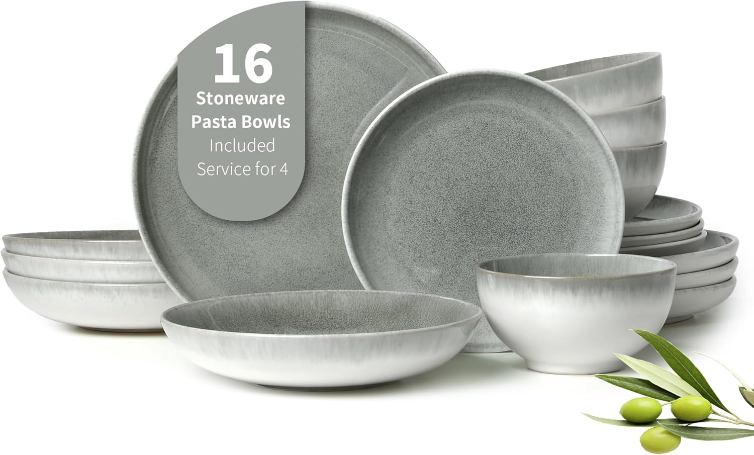 - 【Perfect for Family Gatherings and Holiday Celebrations】Whether it's a family meal, holiday celebration, or casual gathering, this 16-piece reactive glaze dinnerware set is the ideal choice. The set includes 4 x 10-inch dinner plates, 4 x 8-inch salad plates, 4 x 5.5-inch cereal bowls, and 4 x 8.75-inch pasta bowls, providing the perfect solution for all your dining needs.