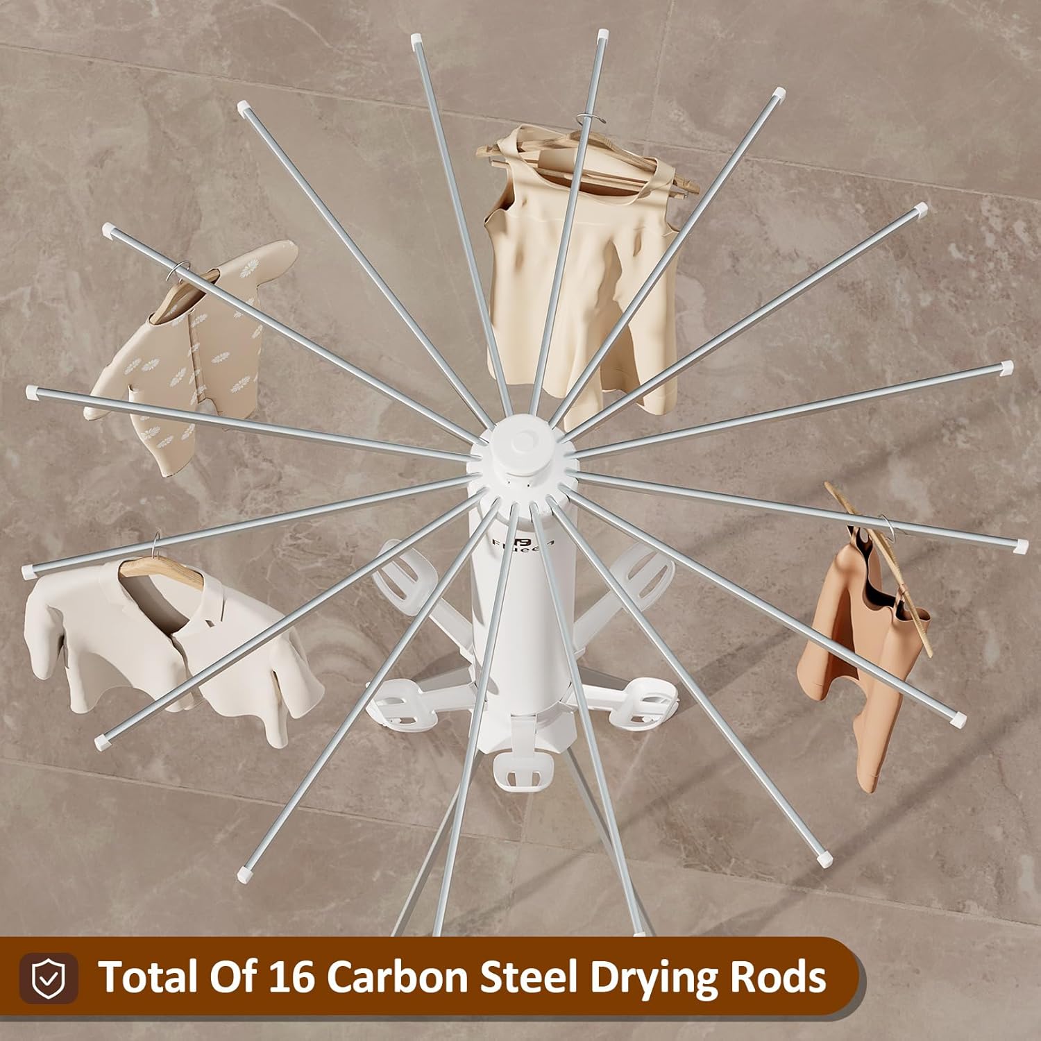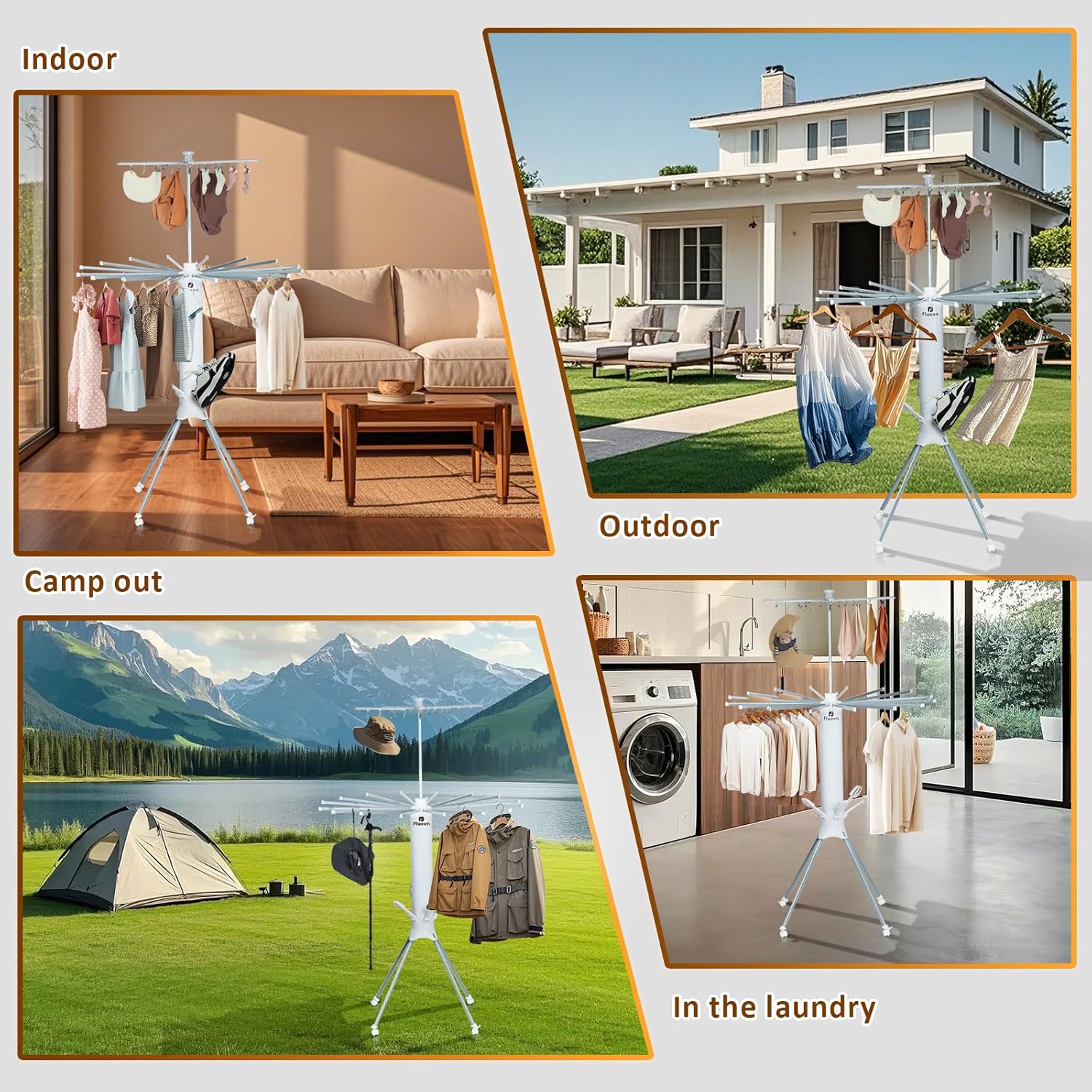 - 【Enhanced Stability and Mobility Features】 The four supporting rods under our four-legged laundry drying rack are equipped with movable universal wheels,offering more stability than a tripod and easier movement.The wheels come with a foot brake system to fix the rack in place and a ground spike for added wind resistance,ensuring your clothes dryer rack remains secure during sudden gusts of wind.Additionally,the customizable drying space allows you to fold or open only the drying rods you need,and the top can be loosened to turn the entire rack 360°around to suit your drying needs.