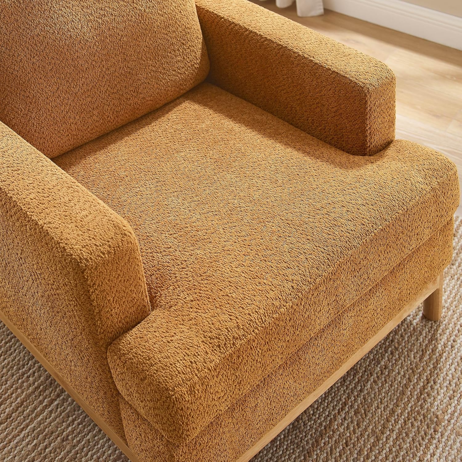 - Solid Wood Structure: This livingroom armchair speaks for durability and stability. Sitting atop solid rubber wood base, its seat is constructed from solid wood and high-density foam wrapped pocket spring, which easily holds up to 350lbs and is resistant to sagging