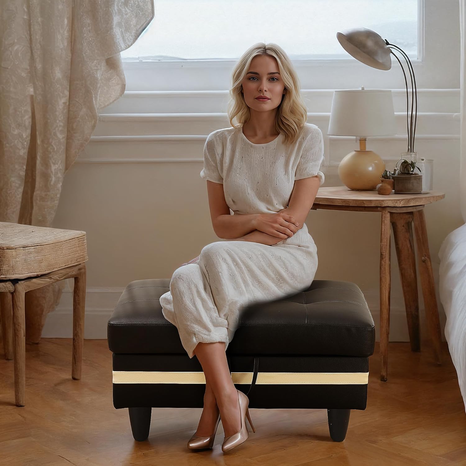 - OTTOMAN BENCH: This versatile storage ottoman doubles as a comfortable bench, perfect for entryways, living rooms, or bedrooms. Designed to blend style with functionality, it provides both extra seating and hidden storage, making it a practical and stylish solution for any space.