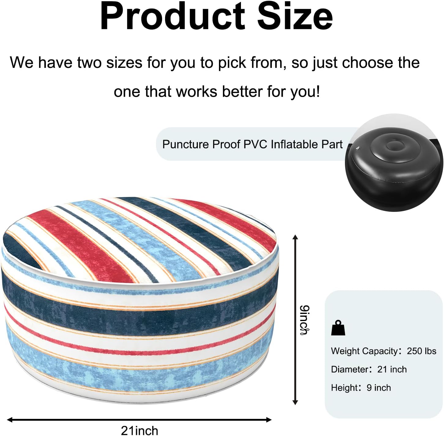 Inflatable Ottoman Stool D21 xH9 for Outdoor/Indoor Use, Water Repellent Patio Foot Rest Stool with Portable Handle,Round Pouf Ottoman Suitable for Garden,Deck and Camping - Stripe Red Blue