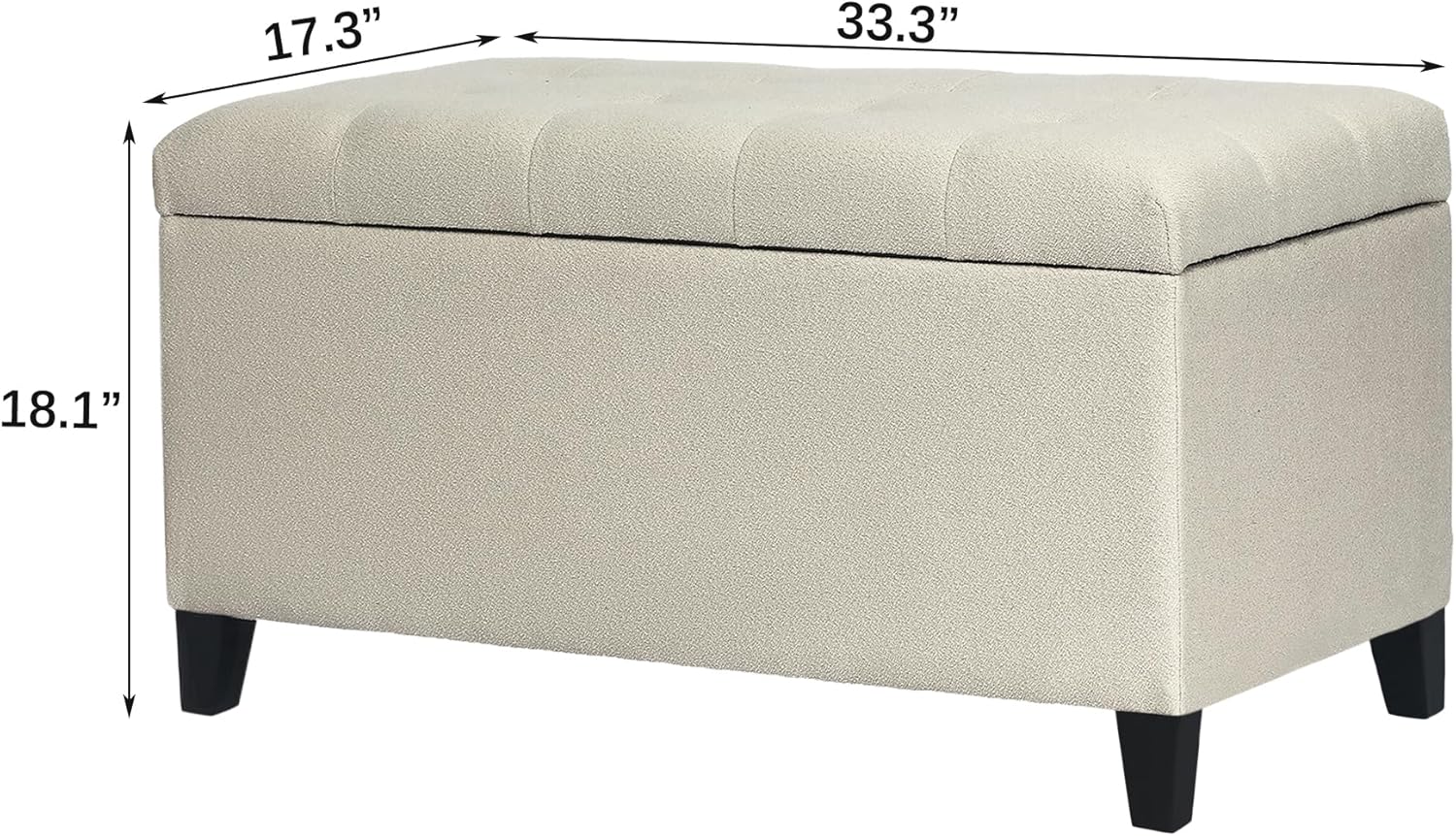 - [Enough Storage Space]: The ottoman bench measures 33.3 "L*17.3 "W*18.1 "H. The ottoman with storage has spacious hidden storage space for storing toys, pillows, blankets, clothing, shoes, etc.