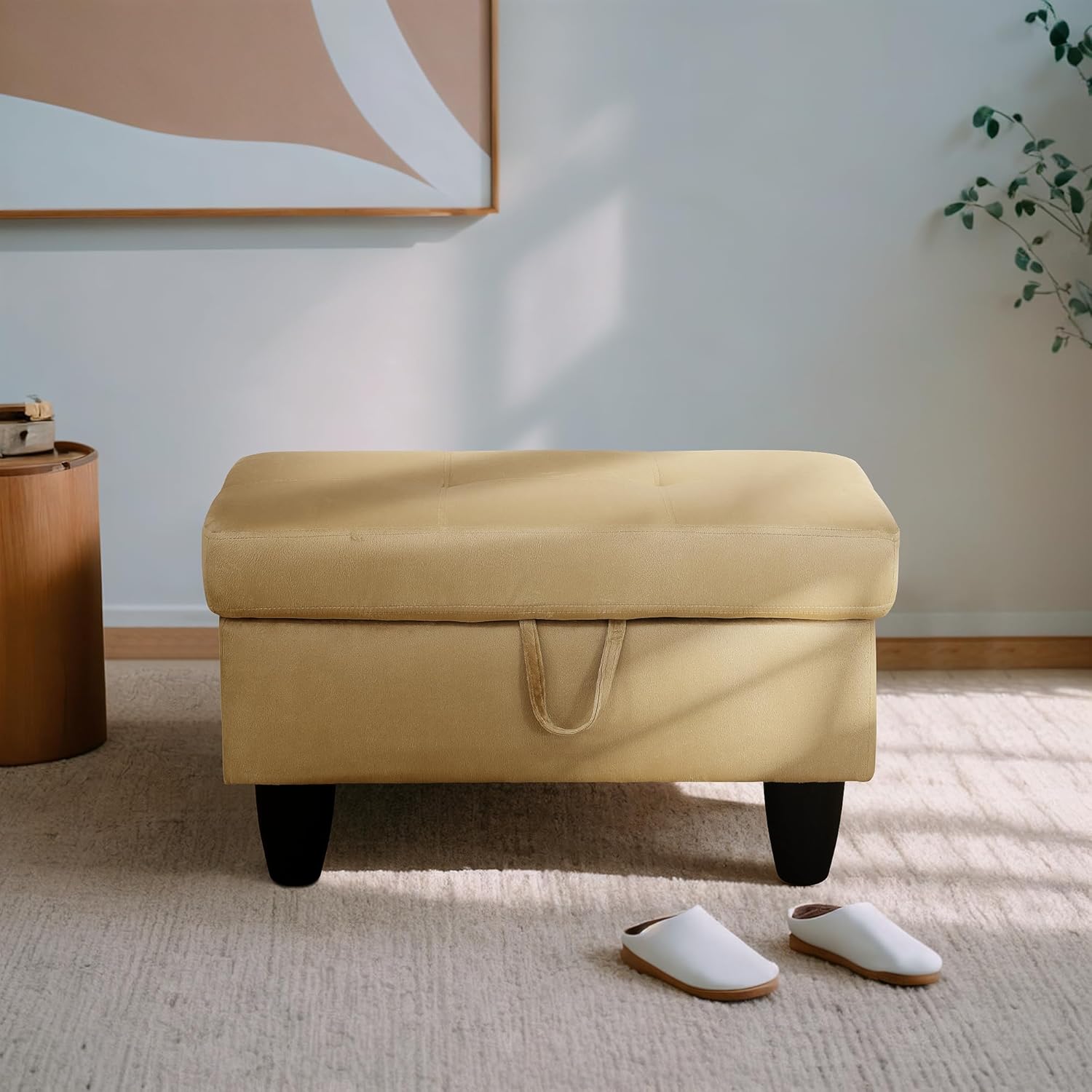 - AMPLE STORAGE: This ottoman offers generous storage capacity for items like pillows, blankets, shoes, seasonal decor, books, toys, and more. Designed with convenient hinges, the lid stays open smoothly and closes gently with a soft-close mechanism. Ideal for organizing your living space.