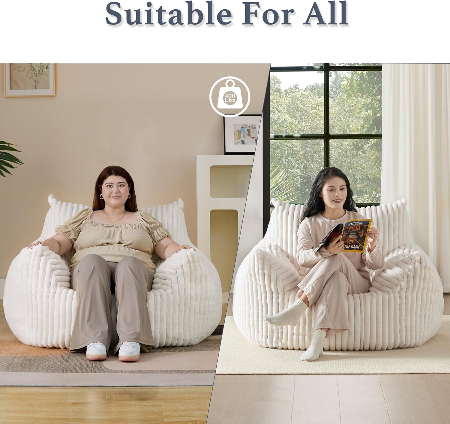 Giant Plush Bean Bag Chair for Adults with Armrests - Oversized Comfy Beige Beanbag Lounge Lazy Floor Sofa Accent Chair for Living Room, Bedroom & Dorm, Cozy Fluffy Single Cloud Mini Couch