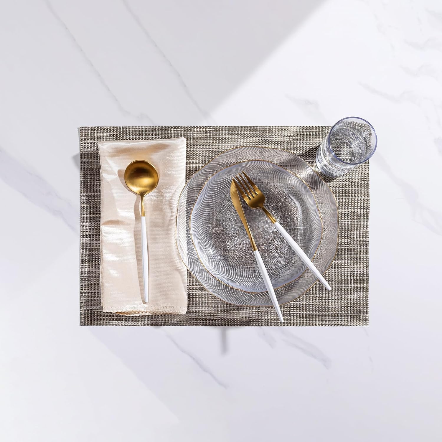 - PERFECT FOR INDOOR AND OUTDOOR:The wipeable placemat is two yarns over two, resulting in a quieter,less textural surface.The neutral color scheme and the classic size (about 12*17 inch)makes the whole table elegant and stylish full of texture!