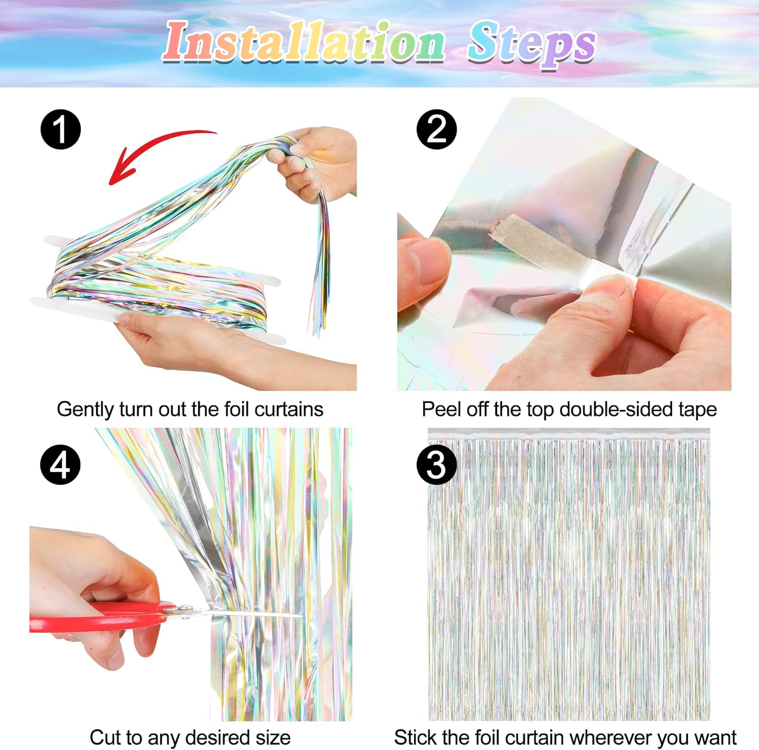 - Easy to Install: The Valentines foil curtains come with adhesive paper on the top, which can be simply peeled and pasted on any smooth surface.