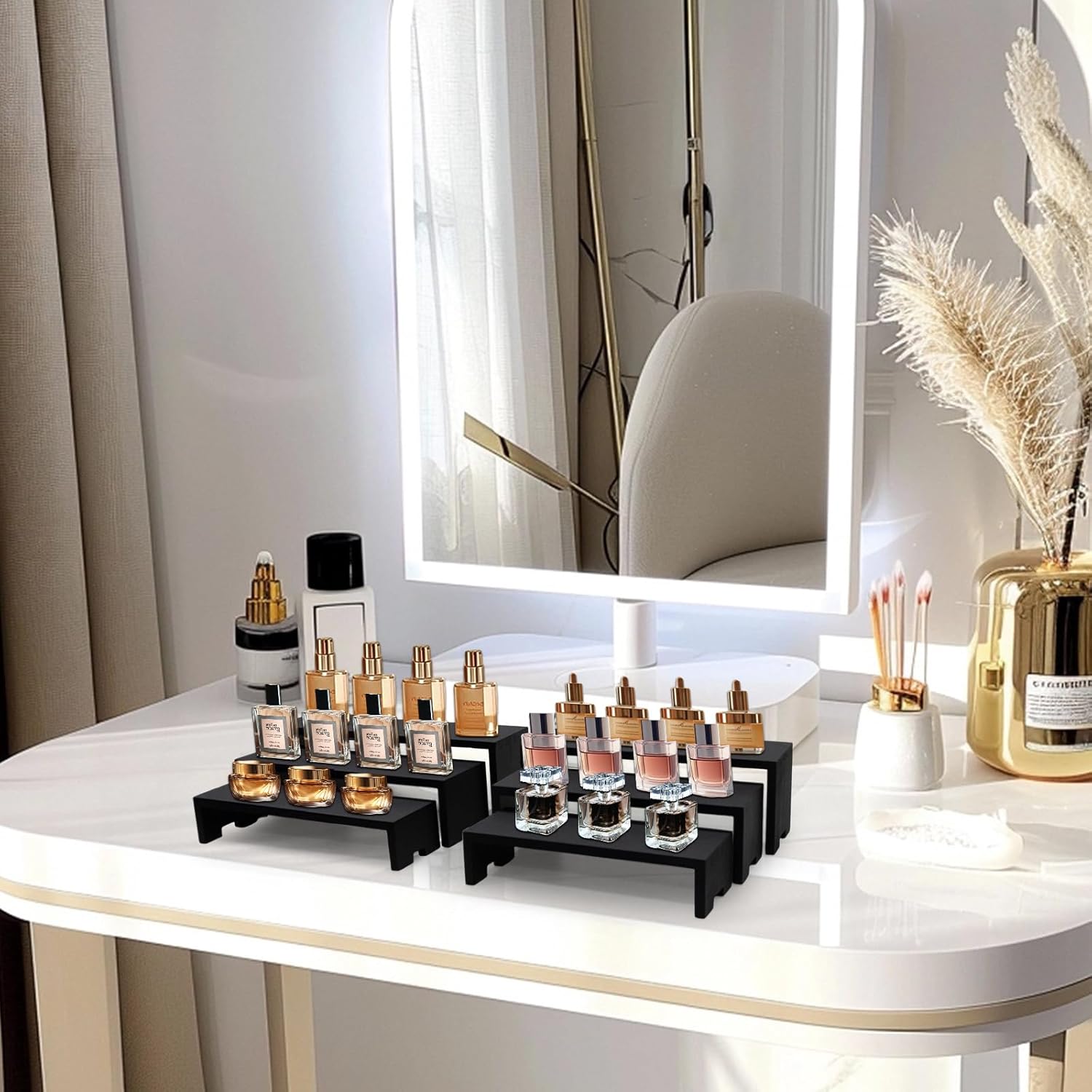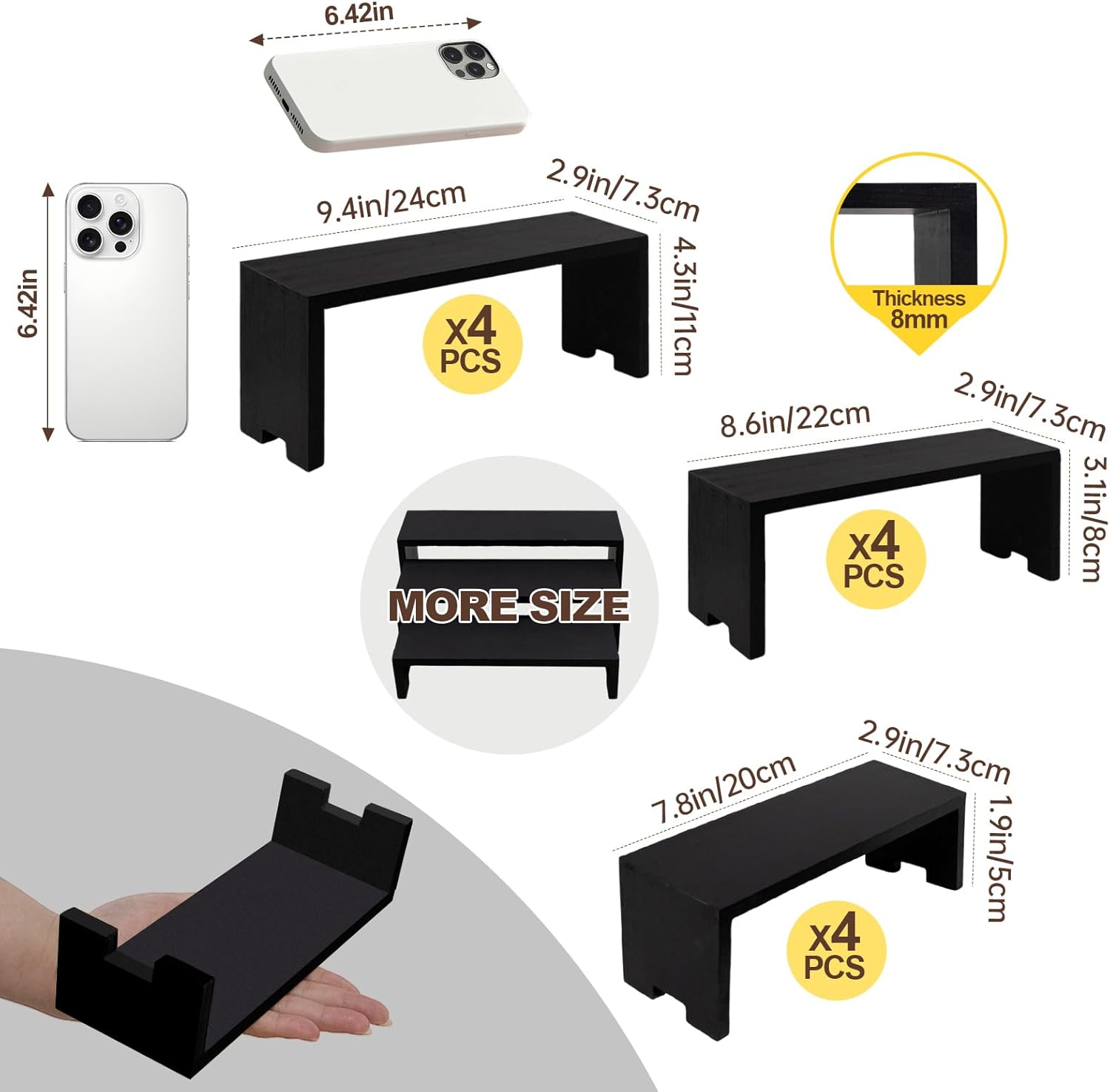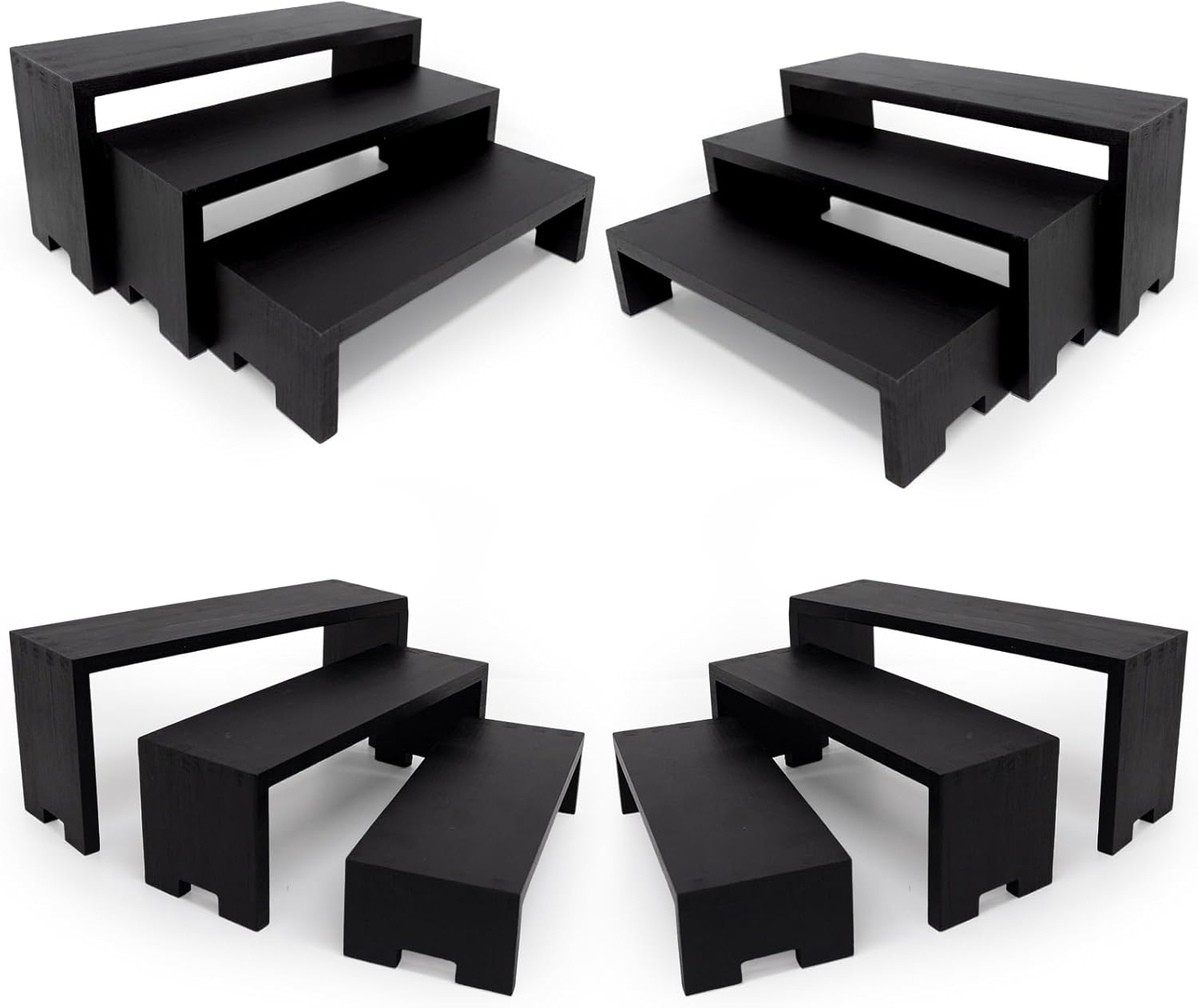 - 【Wooden Tierd Risers for Display】🎁: This 4 set 3 tier small display shelf for cupcakes or vendors has stackable nesting design, so the wooden display risers easily access as desktop storage racks,also they has strong load-bearing capacity for more kinds perfumes, collectible figures,kitchen condiment bottles, bathroom toiletries because of varieties size of (L7.8''/20cm-8.6''/22cm-9.4''/24cm)XW2.9'' /7.3cm