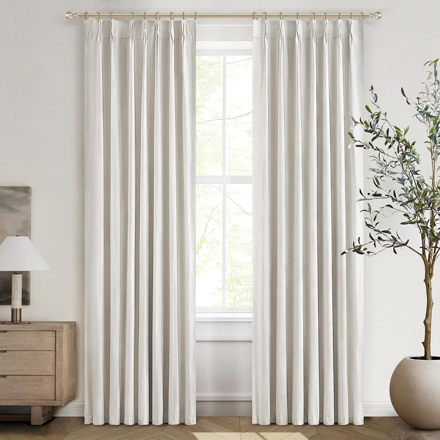 - Pinch Pleats Design:Each panel has 7 pleats.linen draperies are crafted from blended fabric(30%linen,70%polyester),drapes well and not easy-wrinkle.Suitable for various styles:modern,farmhouse,boho,neutral,bedroom,living room,nursery,sliding door,etc.