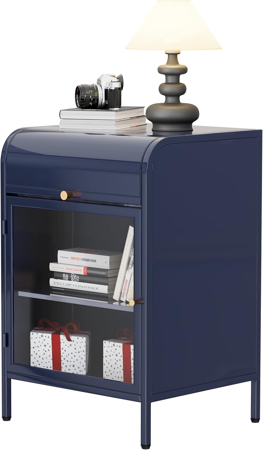 Modern Metal Side Tables, End Tables with Glass Door, 2-Tier Nightstands with Storage Shelves, Accent Table, Slim Sofa Table for Living Room, Bedroom (1, Bule)