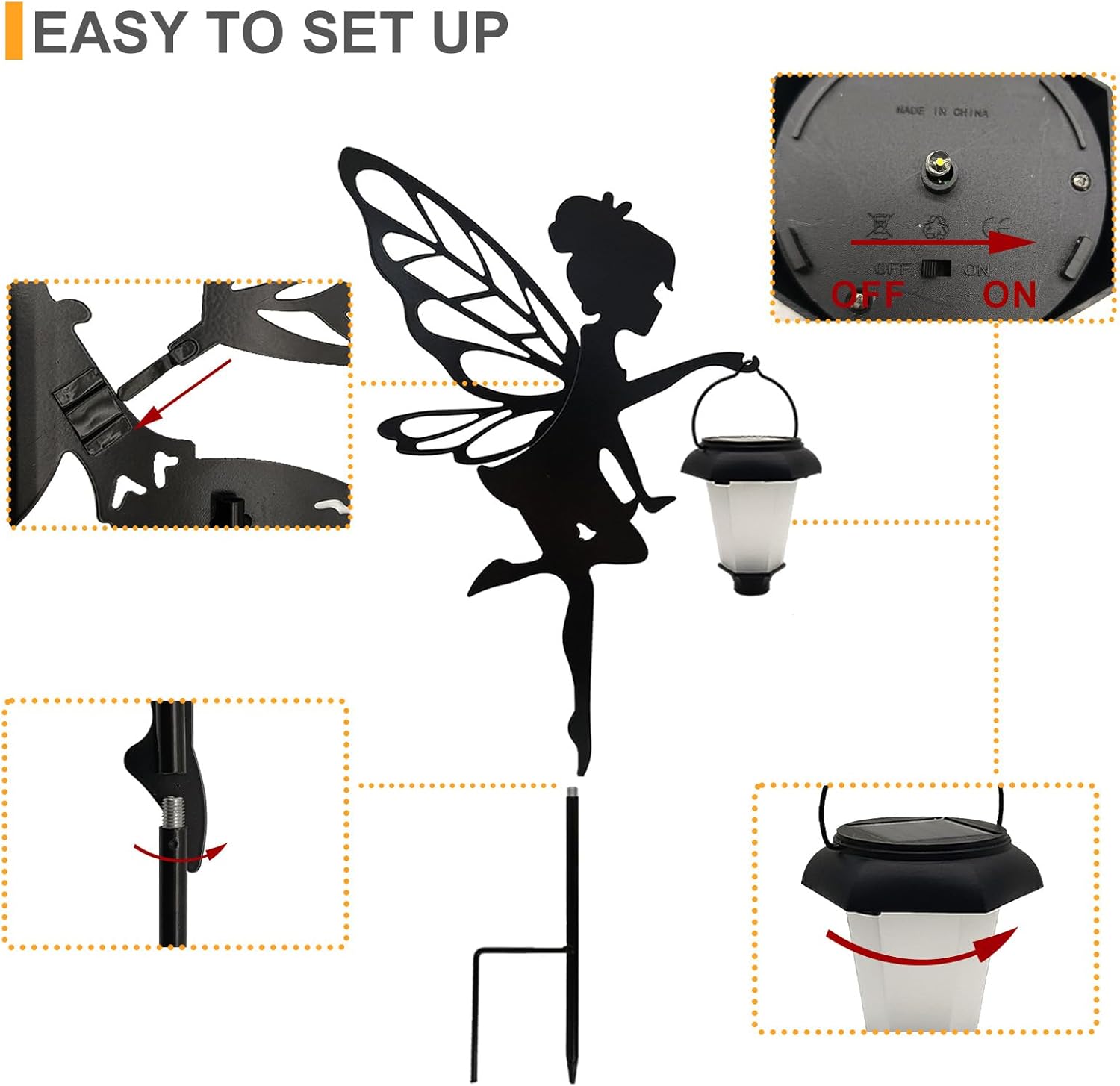 - Easy to Use: No additional tool is required, just screw the ground stakes and fairy statues together by hand, Then attach wings to the fairy statues and hang the light. Simply insert them in a sunny location and you will enjoy your garden ornament