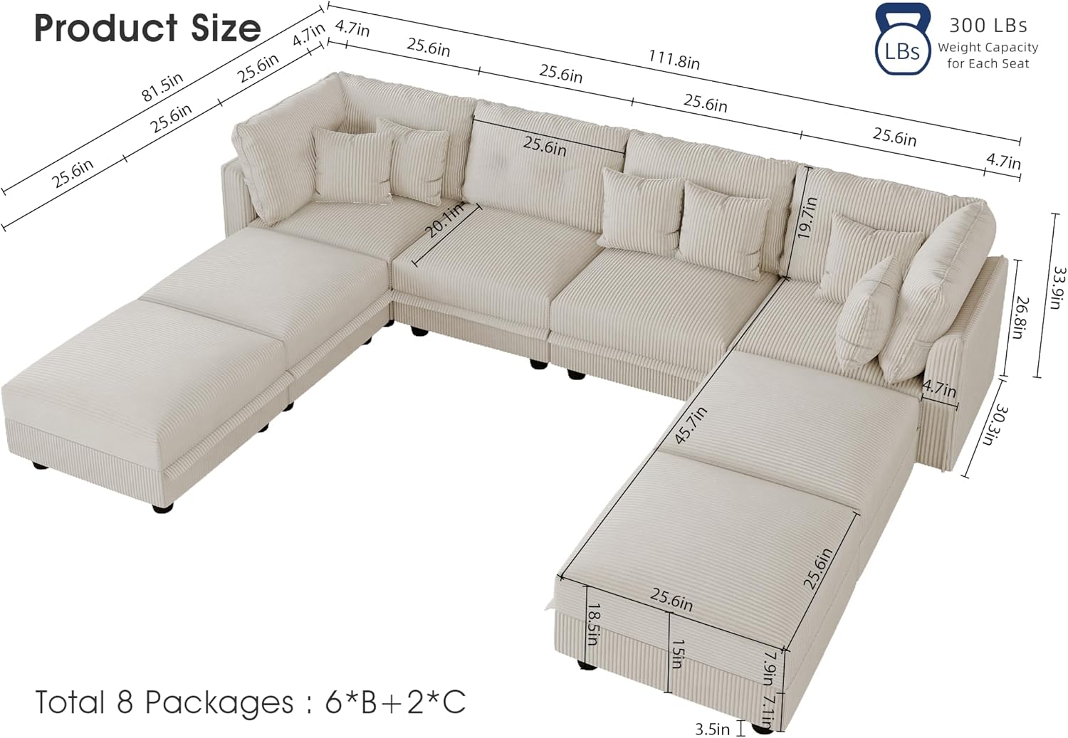 LLappuil Modular Sectional Sofa with Storage Seats, Corduroy Convertible Modular U Shaped Sectional Couch for Living Room, 8 Seat Oversized Sofa with 6 Back Cushion 6 Throw Pillow, Beige