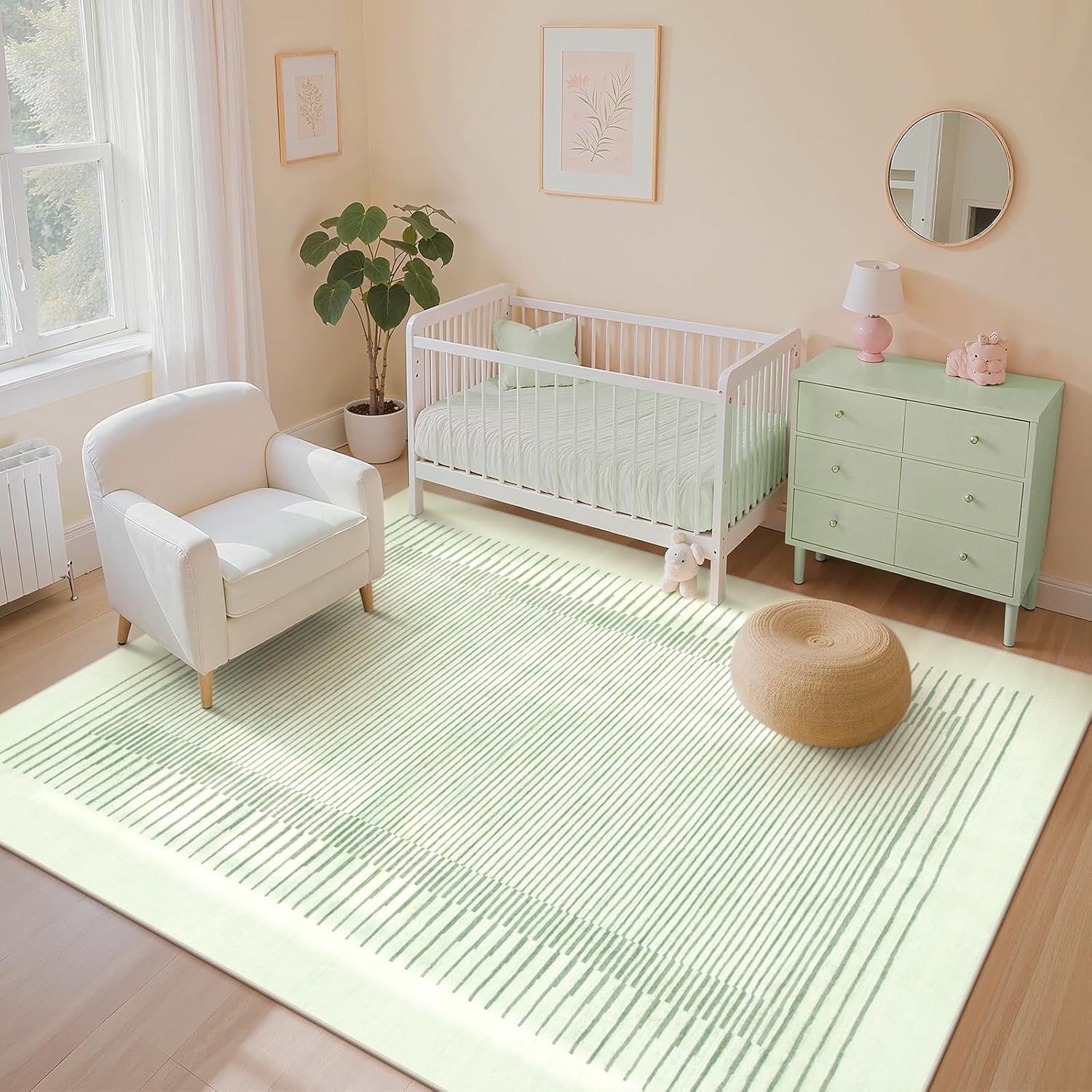 Wonnitar Washable Striped 8x10 Rugs for Living Room, Non-Slip Soft Sage Green Bedroom Rug, Low Pile Minimalist Floor Carpet for Nursery Playroom Dining Room Department (Green, 8' x 10')
