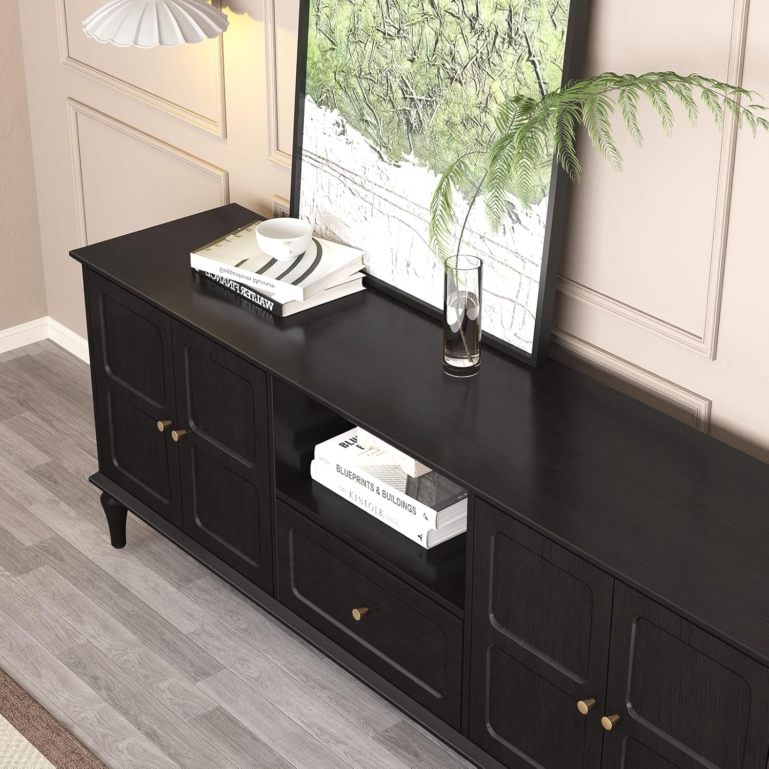 - 【Multiple Uses】: This black TV stand can be used as a Media Entertainment Center and a multifunctional storage cabinet. Its light design with clean lines and gold handles makes it a perfect addition to your living room, or anywhere else.