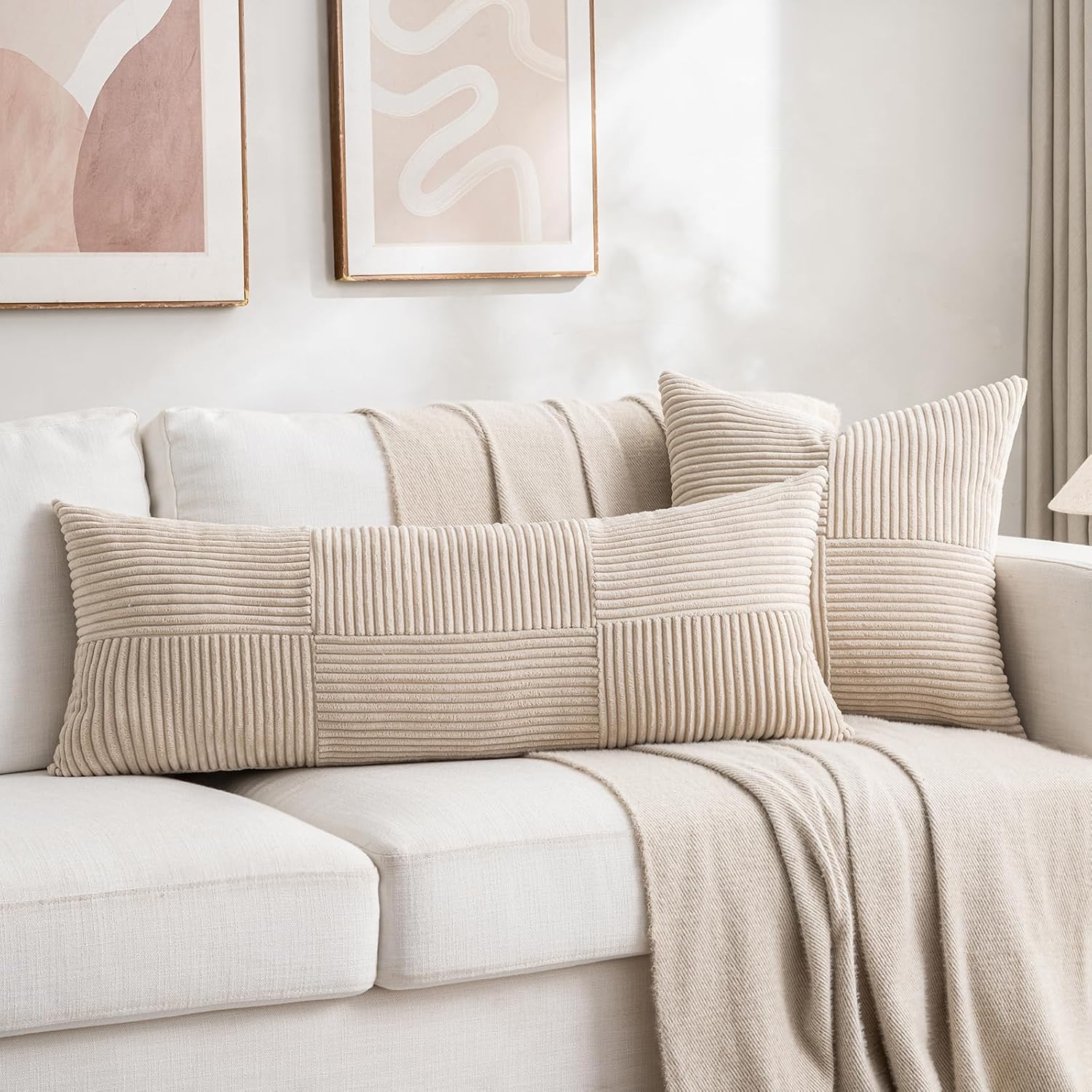 Fancy Homi Set of 2 Tan Boho Long Lumbar Body Decorative Throw Pillow Cover 14x36 Inch for Bed Couch Bedroom Bench, Soft Patchwork Corduroy Textured Pillow Case, Rustic Farmhouse Room Décor