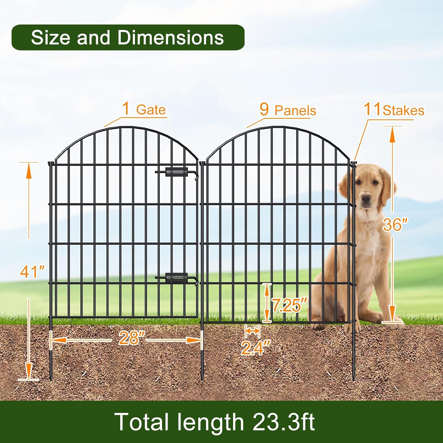 Metal Garden Fence with Gate 36in (H) x 23.3ft (L), 1 Gate+ 9 Panels Dog Fence Border Fence Animal Barrier, No Dig Garden Fencing for Yard Flower Bed Lawn Patio Outdoor, ECG3610, Black