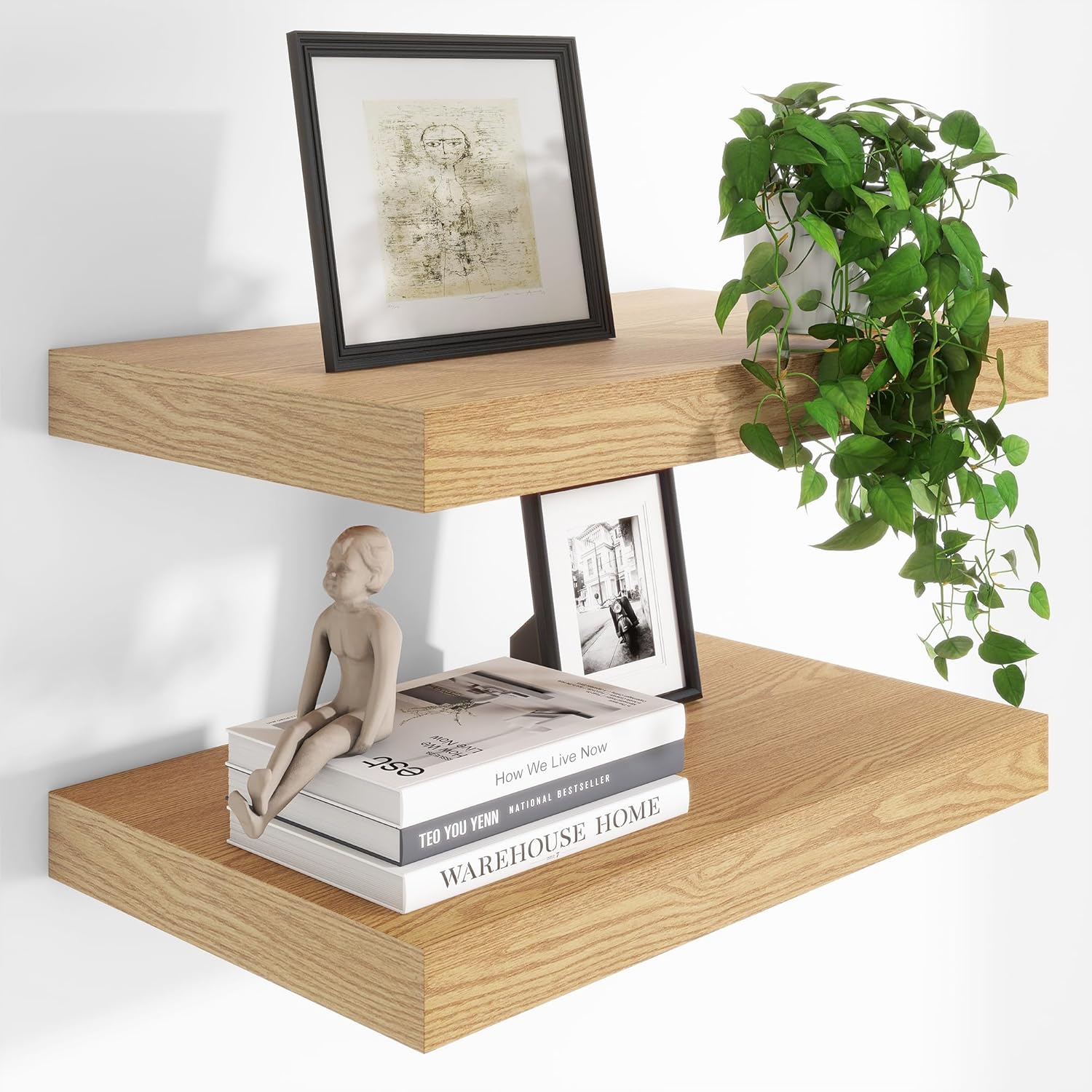 Heimlove 24 x 12 Inch Deep Floating Shelves Wall Mounted with Invisible Brackets,Storage Hanging Shelf for Wall Decor in Bathroom, Bedroom, Toilet, Kitchen, Living Room, Office Set of 2 (Oak)