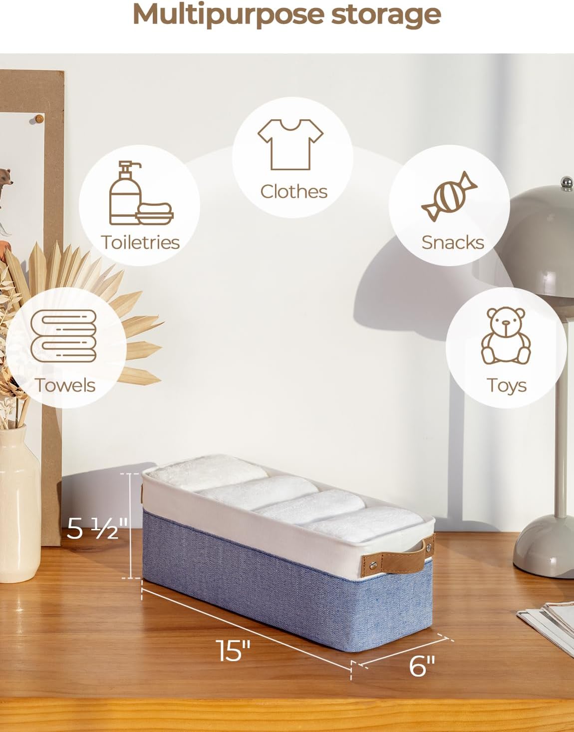 StorageWorks Narrow Storage Bins, Small Basket for Closet and Shelves, Fabric Organizer with Handles, Toilet Paper Storage, Blue and White, 2-Pack
