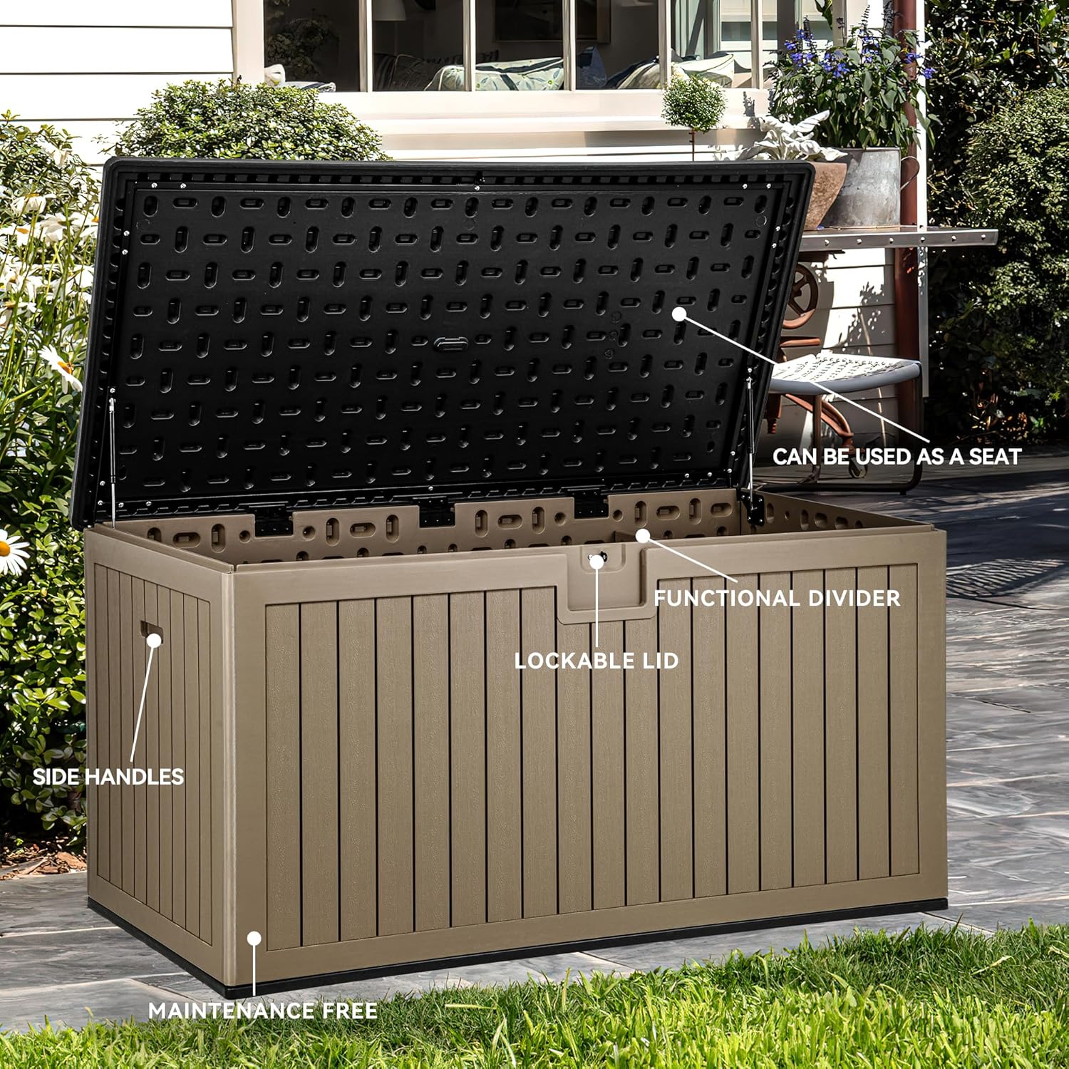 - Multi-functional Design: Featuring gas struts, our storage box facilitates smooth, slow opening and closing for added safety; Move this deck box around thanks to the side handles; It's lockable for secure storage