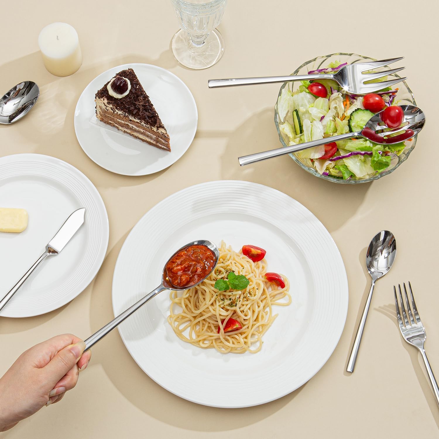 - SILVERWARE SET INCLUDES: 45-piece flatware set includes 8 dinner knife (8.92 inch/2.75 oz) , 8 dinner fork (8.31 inch/2.07 oz), 8 dinner spoon (8.11inch/2.64 oz), 8 salad fork (7.01 inch/1.41 oz)and 8 teaspoon (6.9 inch/1.63 oz), and the hostess set (1 serving spoon, 1 serving sork, 1 sutter snife, 1 slotted serving spoon, 1 sugar spoon), service for 8