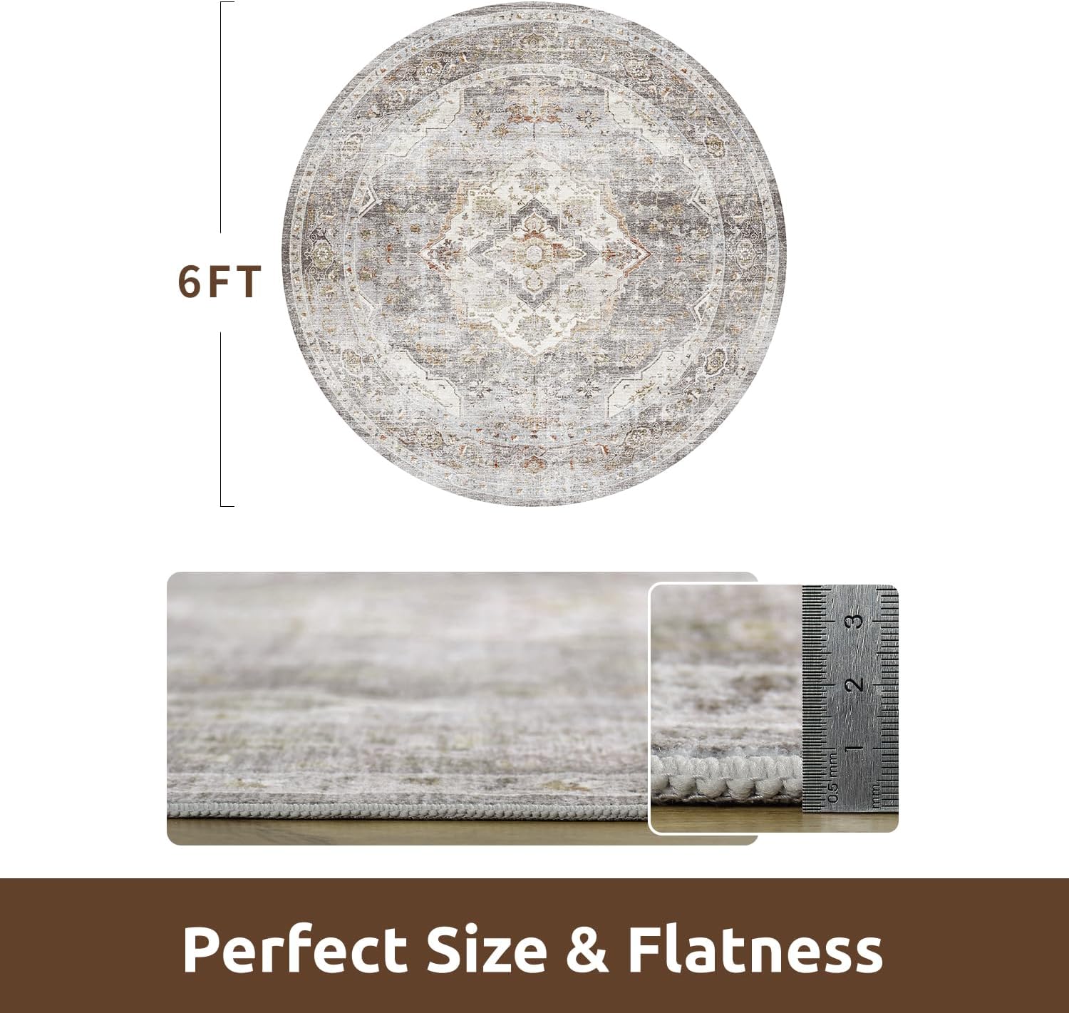 AMOAMI-6FT Round Rug-Rugs for Living Room-Vintage Soft Grey Rugs for Bedroom-Non Slip Circle Rug-Machine Washable Rug for Dining Room Living Room Bedroom Office Under Table