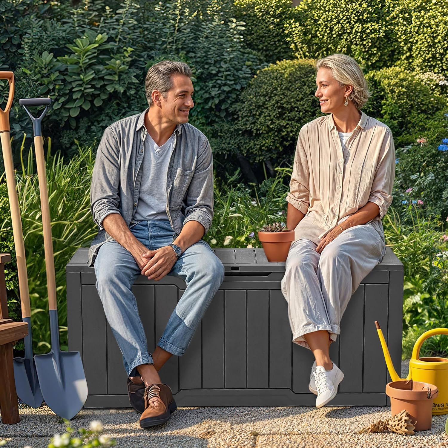 - Extra Seating: Doubling as a comfortable bench seat, this plastic deck box can support up to 485 pounds; Set it up in just 15-30 minutes, and enjoy its unique wood-grain texture that seamlessly blends with any patio or deck decor in no time