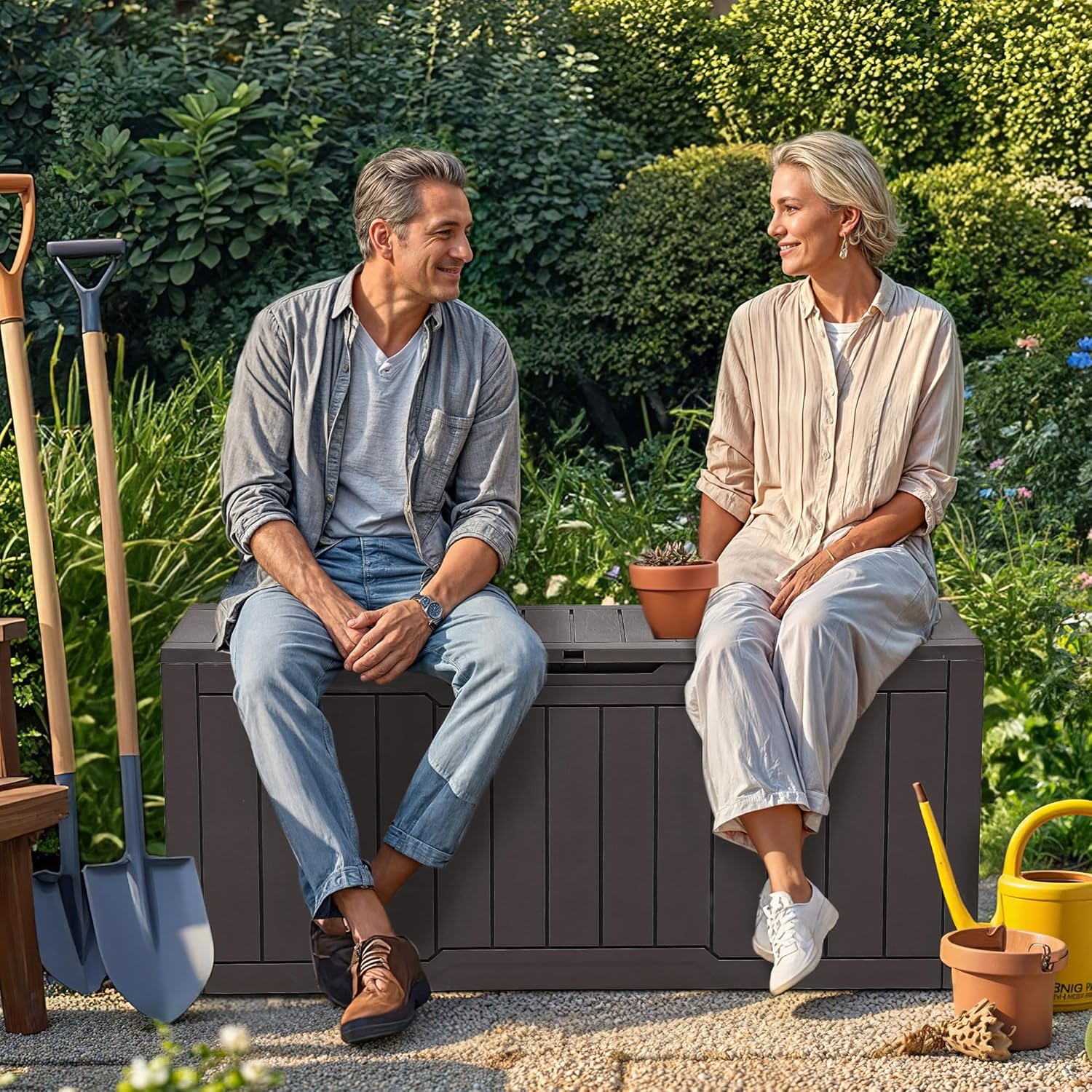 - Multi-Purpose Use: Ideal for both indoor and outdoor storage needs, this plastic deck box accommodates patio cushions, gardening tools, pool gear, and other items to meet your needs; The deck box with lock feature offers enhanced security