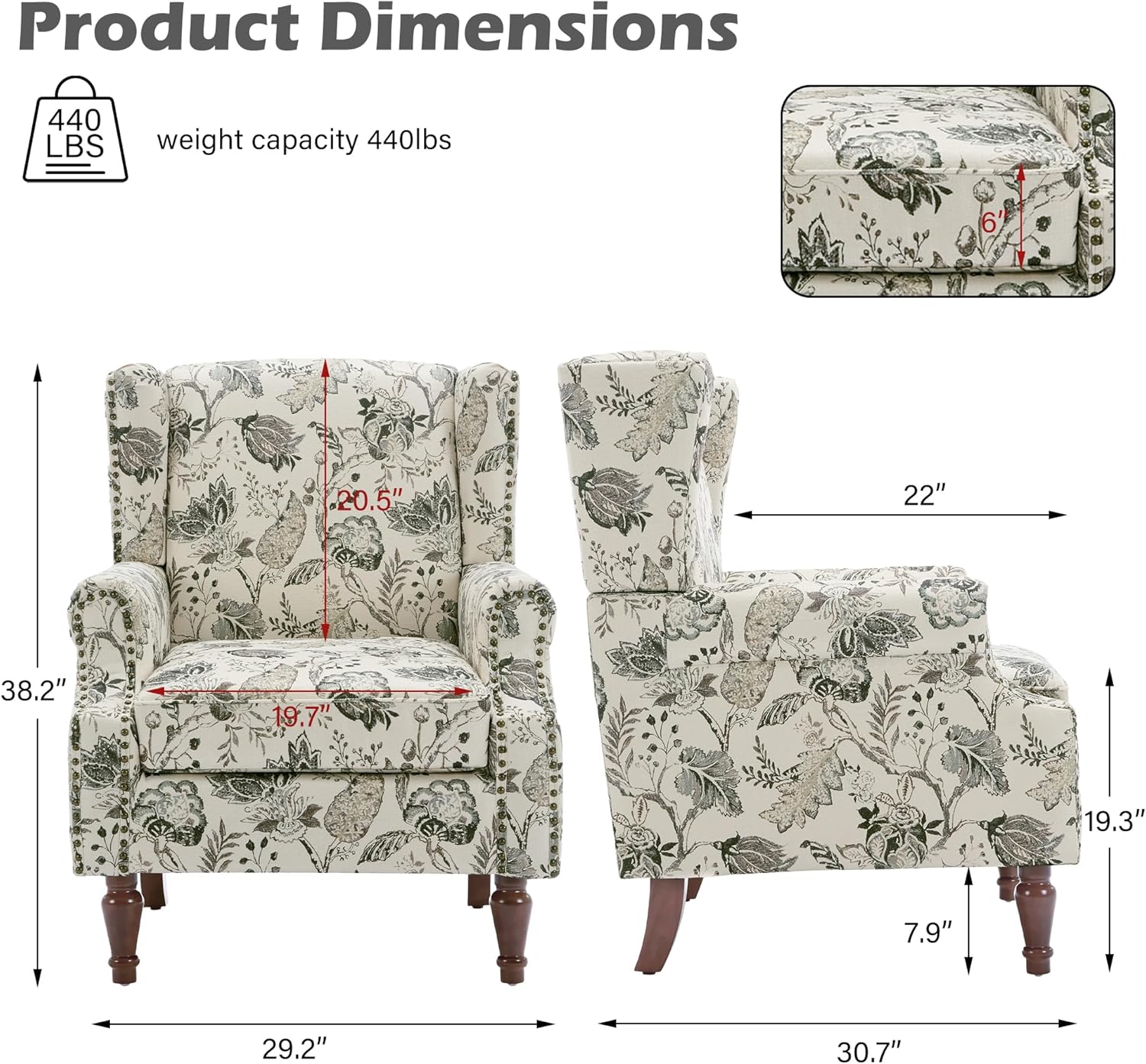 UIXE High Back Floral Accent Chairs Set of 2, Upholstered Armchair in Fabric, Retro Printed Wingback Arm Chair for Living Room, Nailhead Trim Single Sofa Bedroom Reading Seat - Plants Beige