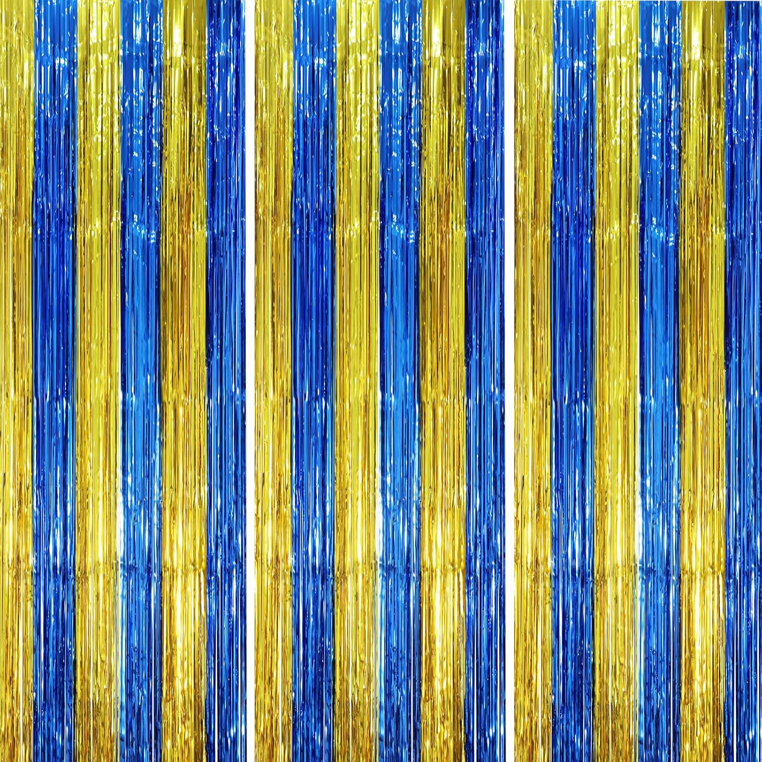 3 Pack 3.3 x 8.2 ft Blue Gold Foil Fringe Backdrop Curtains, Tinsel Streamers Party Decorations, Fringe Backdrop, Door Shimmer for Father's Day Graduation or Birthday Party