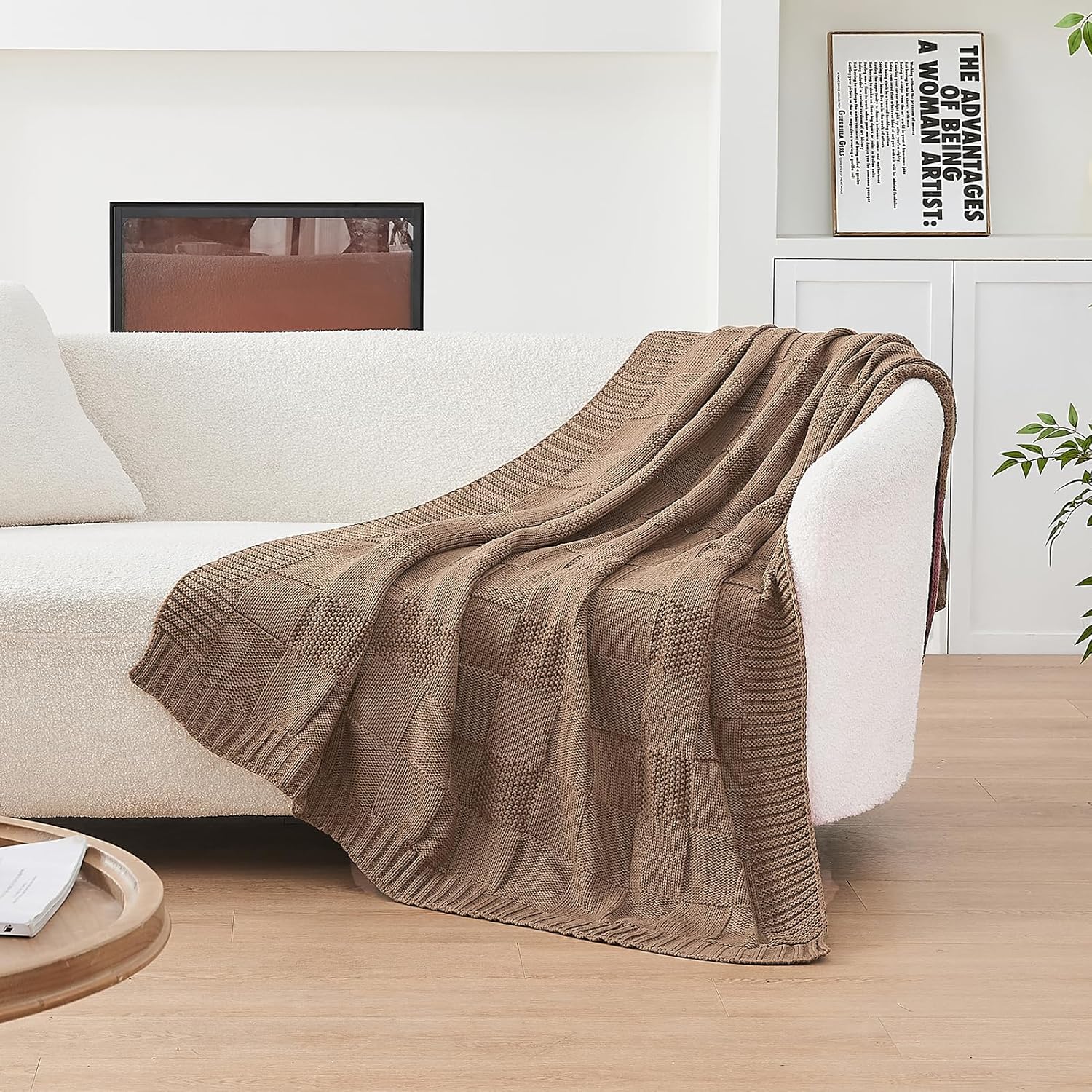CozeCube Check Knit Throw Blanket, Light Brown Checkered Throw for Couch, Decorative Christmas Soft Cozy Warm Knitted Blanket for Bed Sofa Living Room, 50"X60"