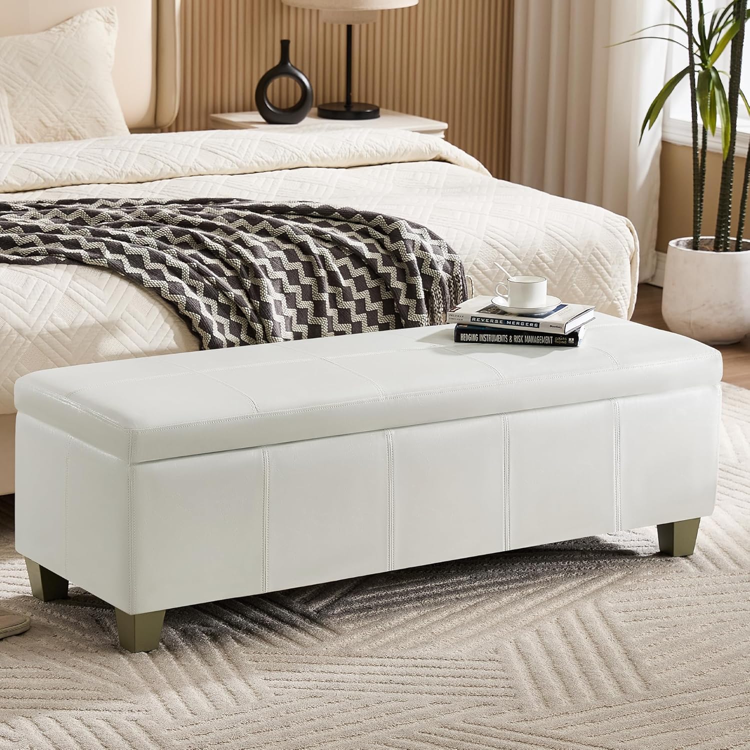 51" Faux Leather Storage Ottoman, Stitch Tufted Rectangle Upholstered End of Bed Storage Bench, Entryway Large Couch Ottoman with Wooden Legs,White