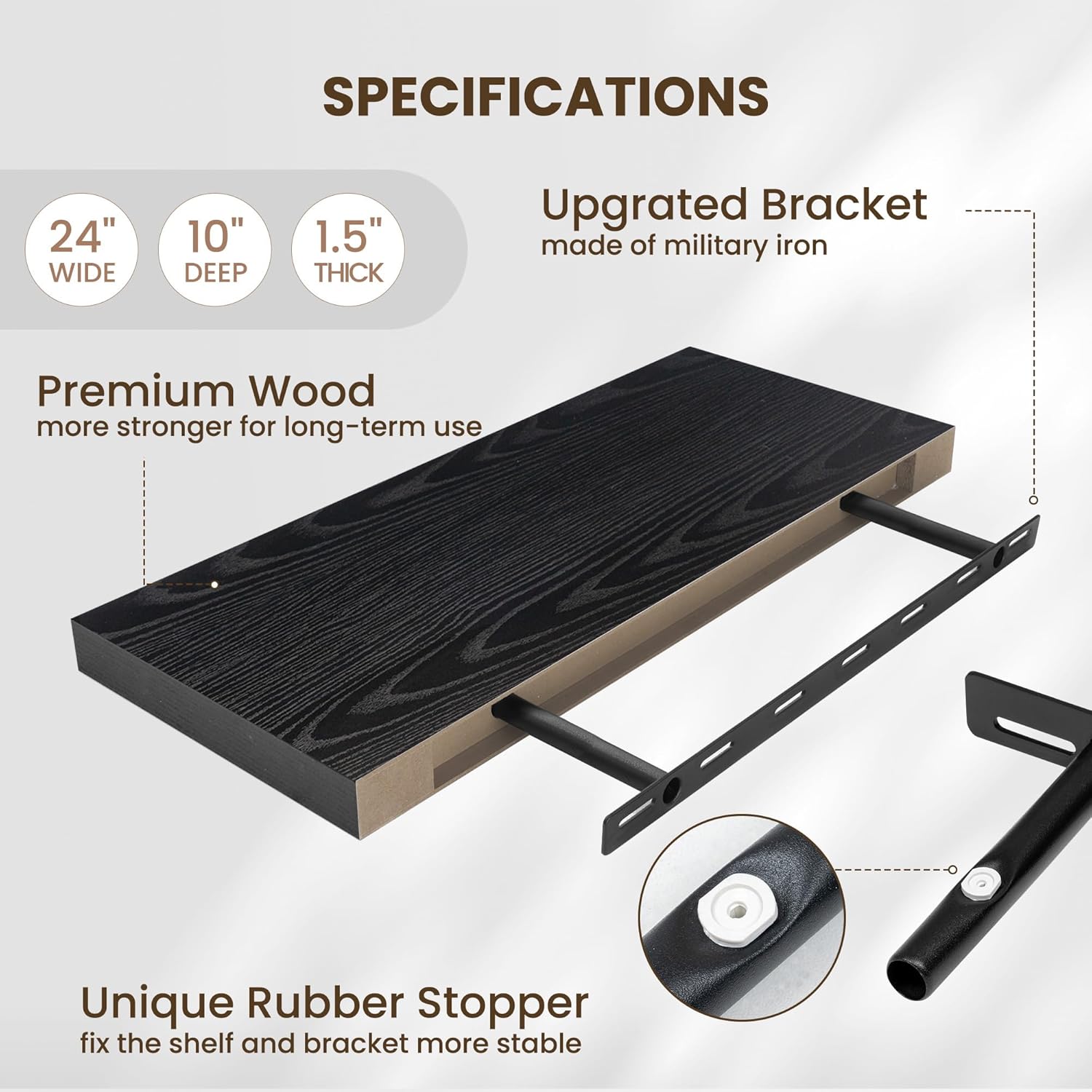 Fun Memories 24 Inch Floating Shelves Wall Mounted, 10 Inch Deep Wall Shelves, 24 x 10 Floating Shelf for Living Room Bathroom Bedroom, Black, Set of 2