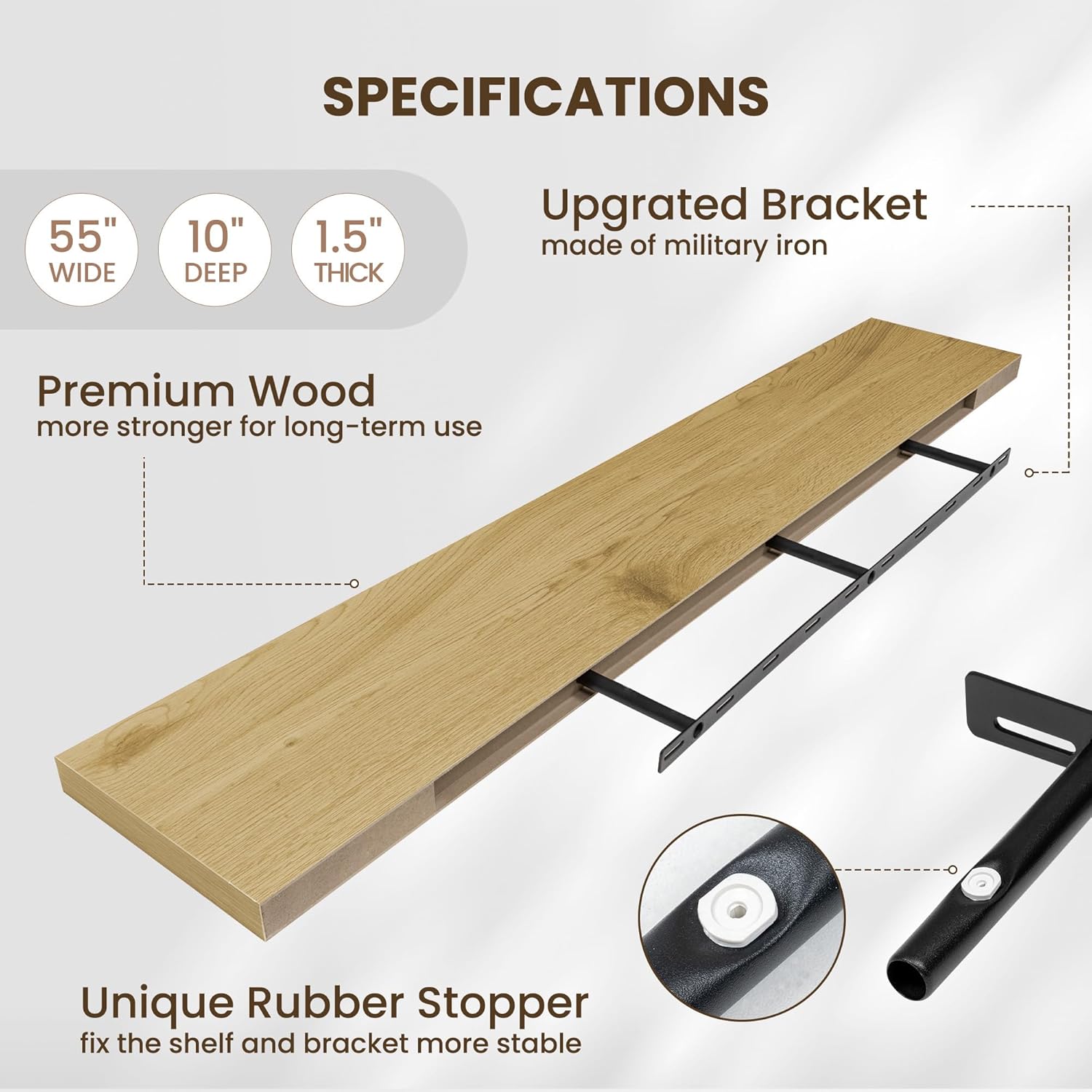 - INVISIBLE & STURDY BRACKET: This floating shelf features a simple and elegant design with an invisible bracket that creates a floating effect. The sturdy hidden support and special rubber stoppers ensure the shelf stays firmly in place, offering both strength and a clean, modern style
