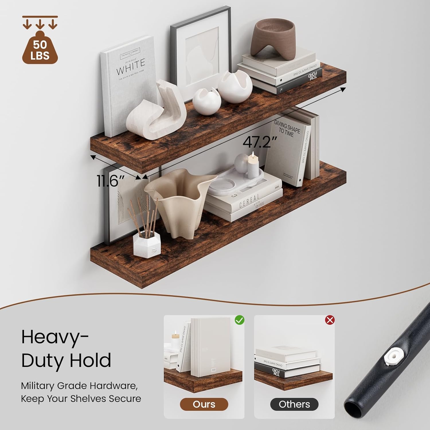 Heimlove 48W x 12D Long Floating Shelf, 12 Inch Deep Floating Shelves for Wall Set of 2, Wood Shelves for Bedroom Living Room Bathroom Kitchen Home Office, Rustic Brown