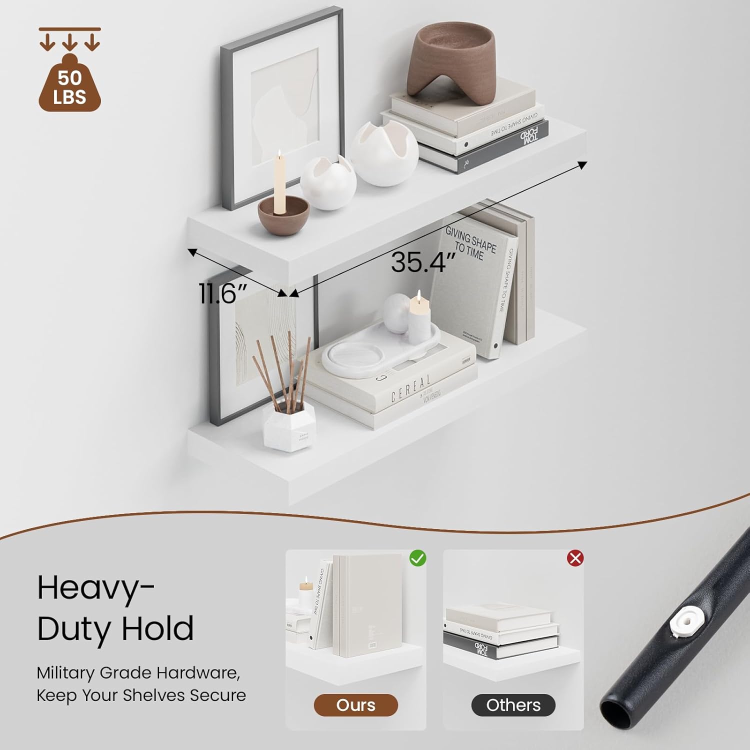 - Extra Deep Floating Shelves: Measuring 11.6” D x 35.4” W x 1.5” H, these shelves are crafted for maximum depth and durability. The spacious 12” depth gives you plenty of room for stylish display, organized storage, and decorative accents. Perfectly suited for your bathroom, kitchen, or living room, they enhance both function and flair in any space!